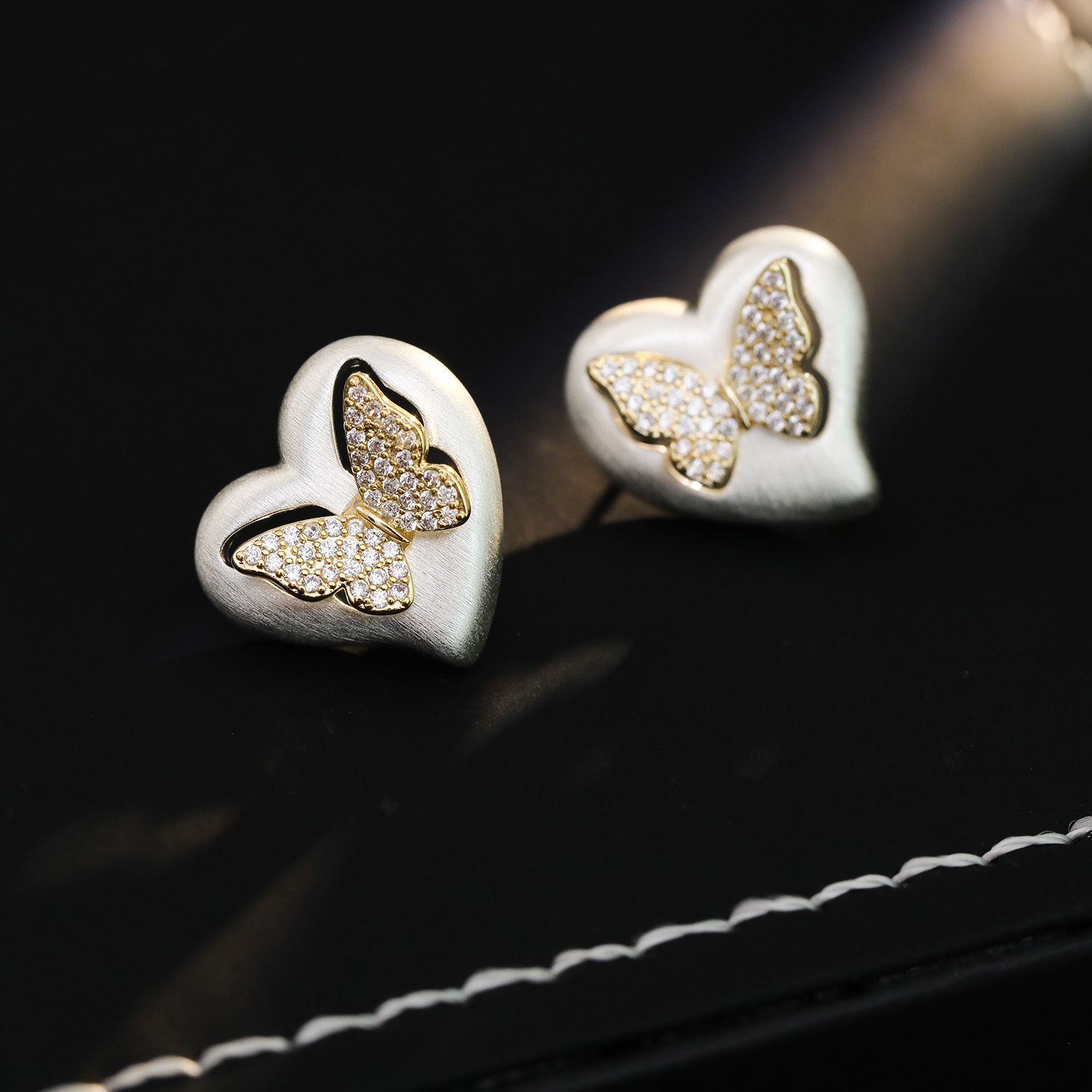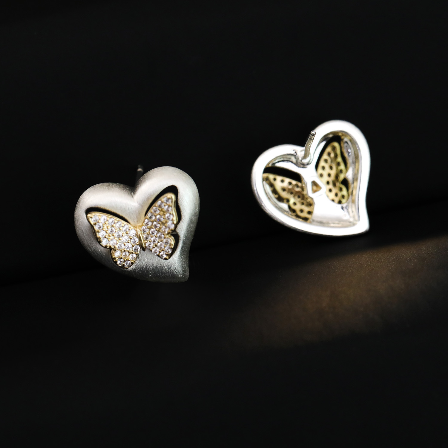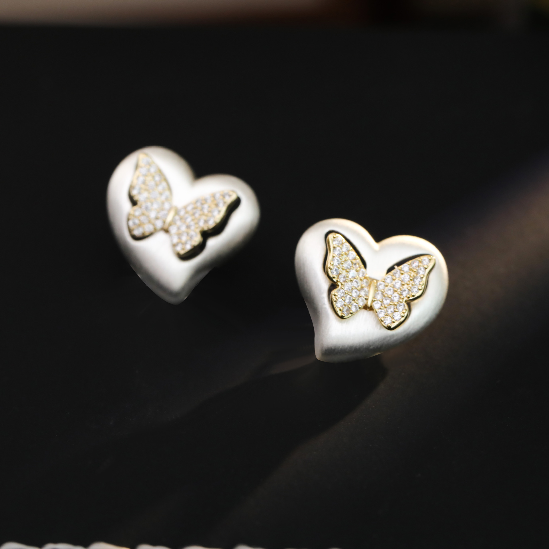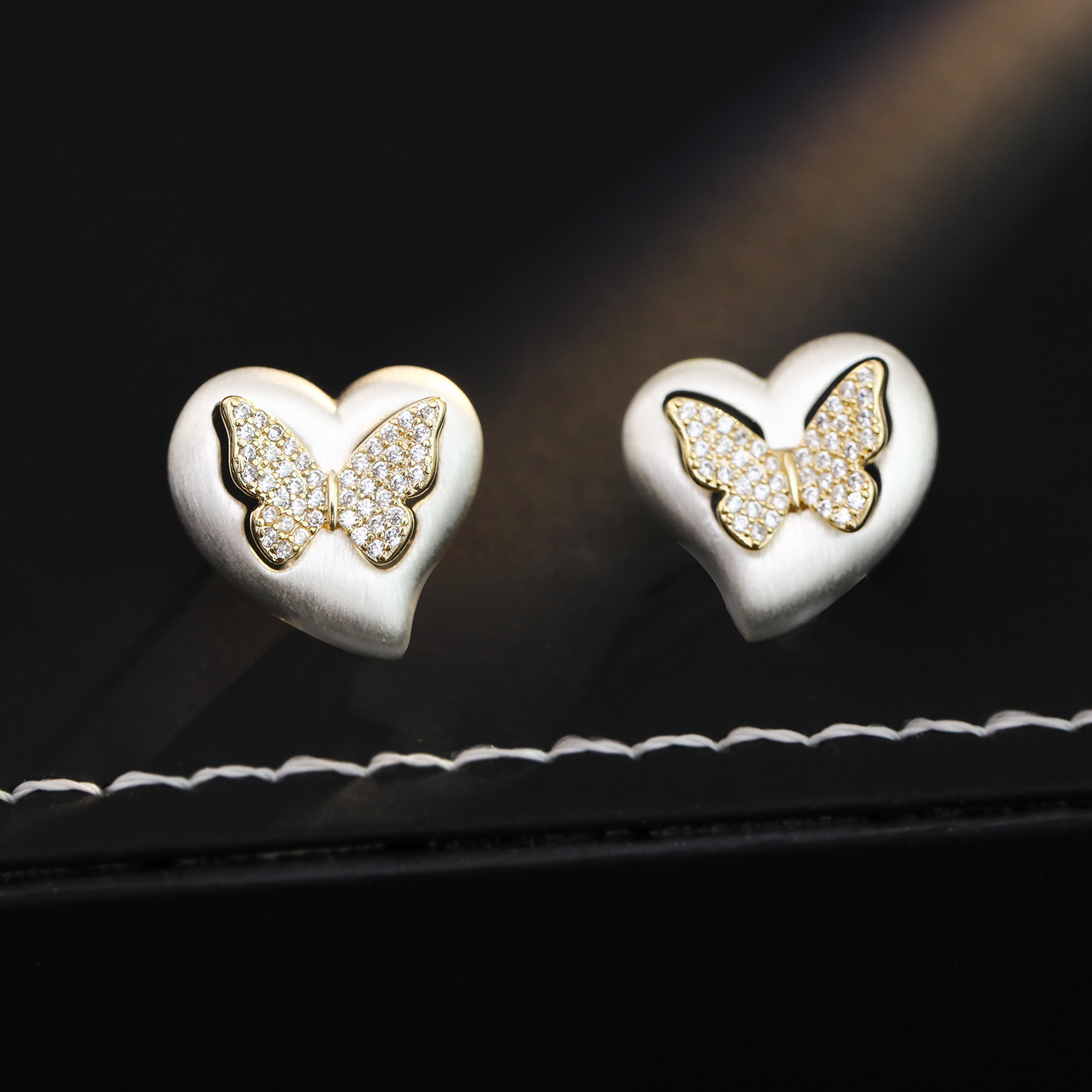 Befestiger Zirkonia Messing Ohrring, Herz, 14 K vergoldet, gebürstet & Micro pave Zirkonia & für Frau, Silberfarbe, 15x16mm, verkauft von Paar