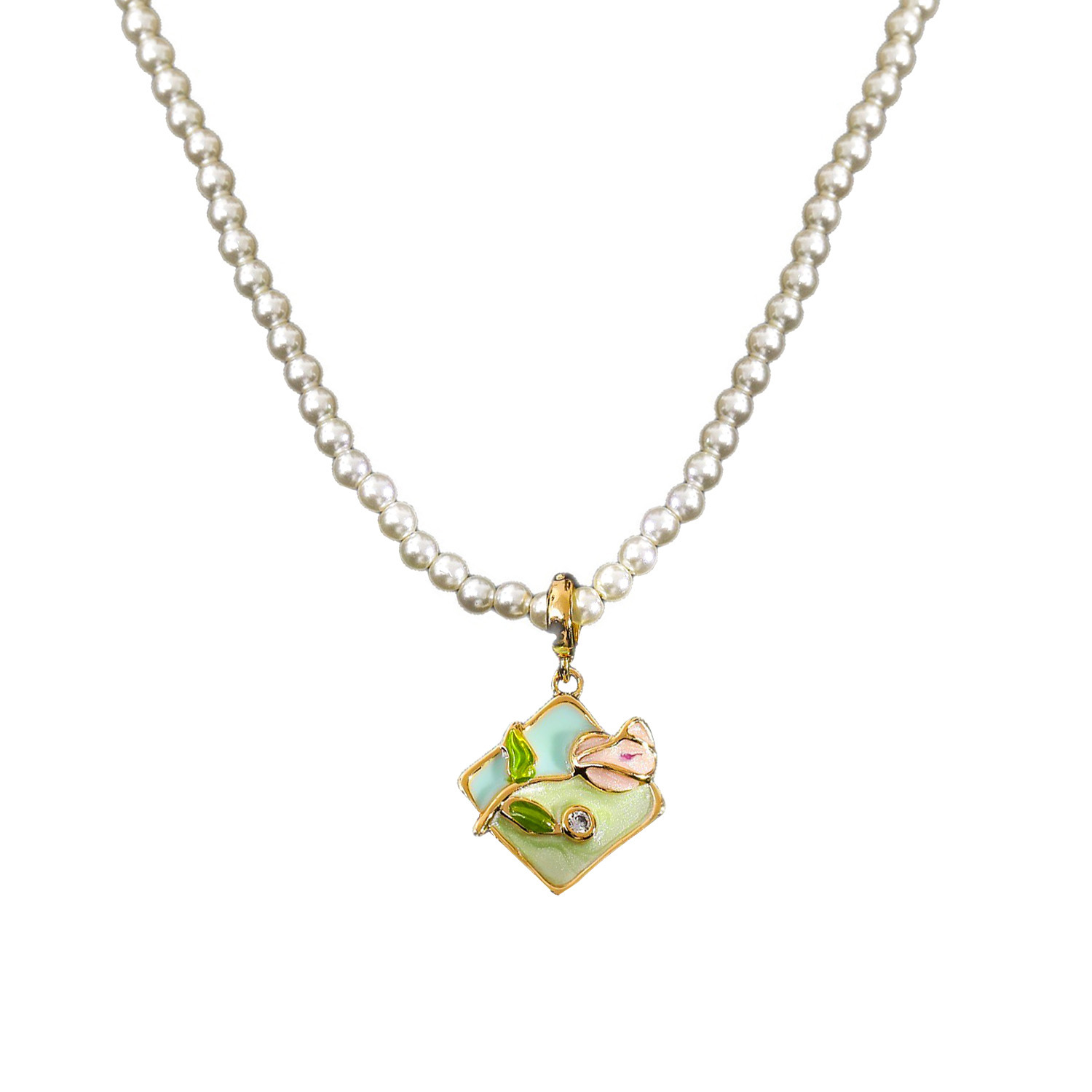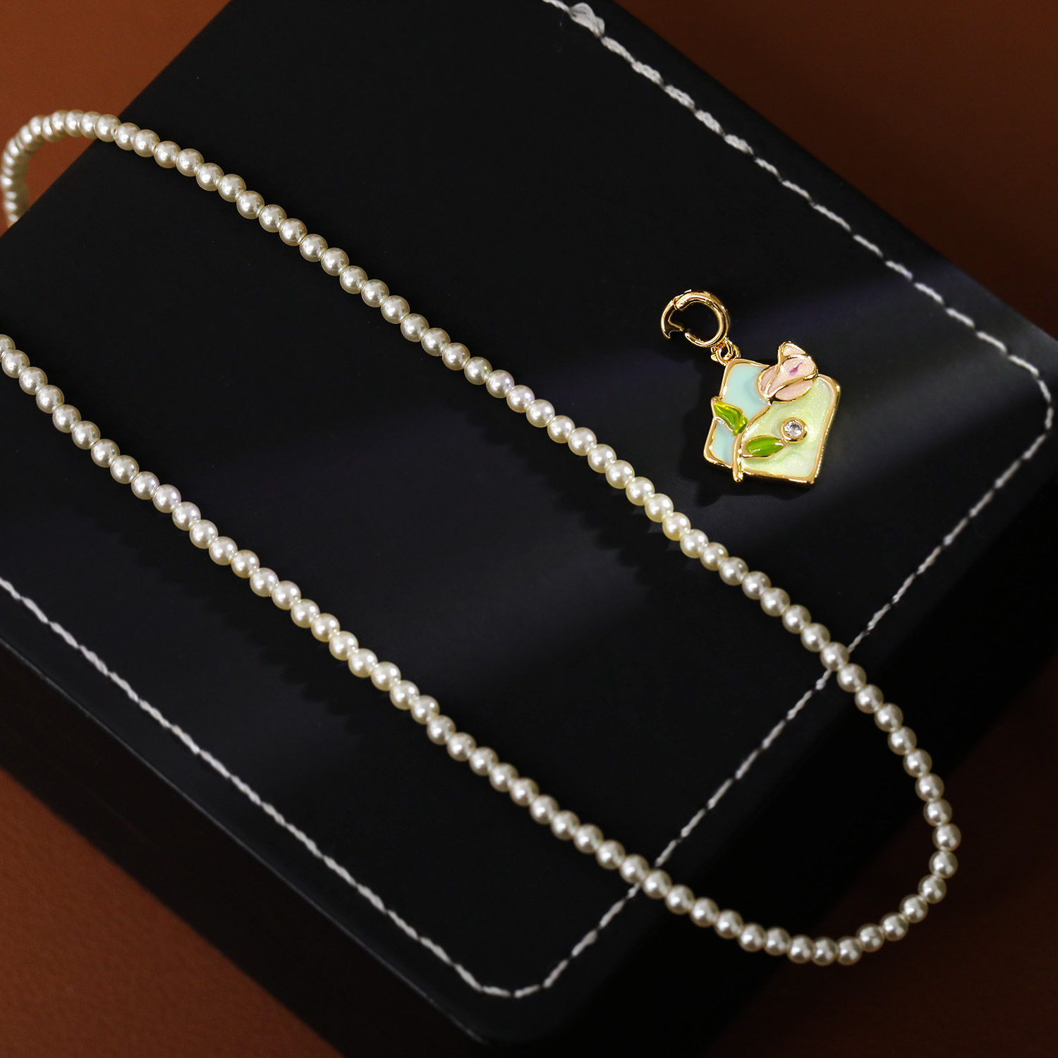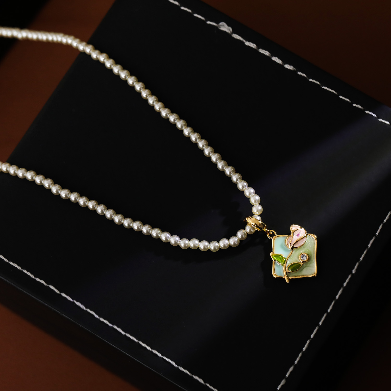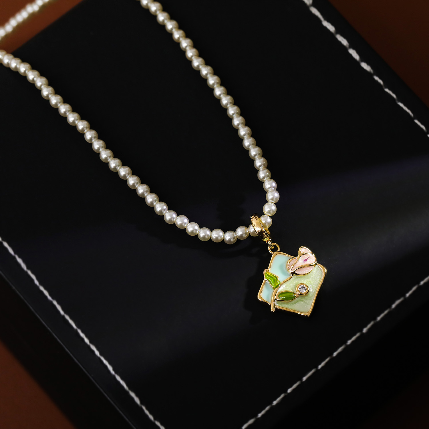 Glasperlen Halsketten, Messing, mit Glasperlen, mit Verlängerungskettchen von 6cm, Tulpe, plattiert, Micro pave Zirkonia & für Frau & Emaille, The pendant is 2.7cm long and 1.7cm wide, Länge:39 cm, verkauft von PC
