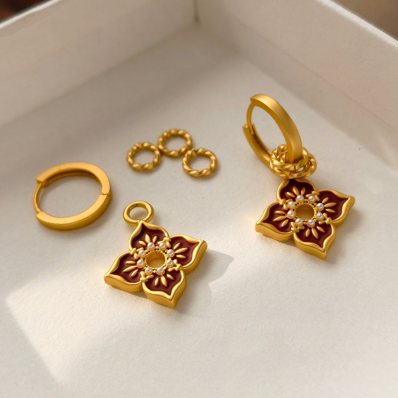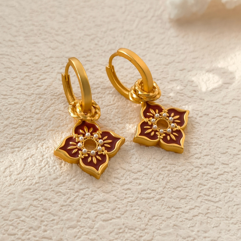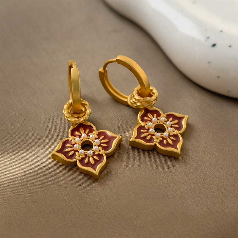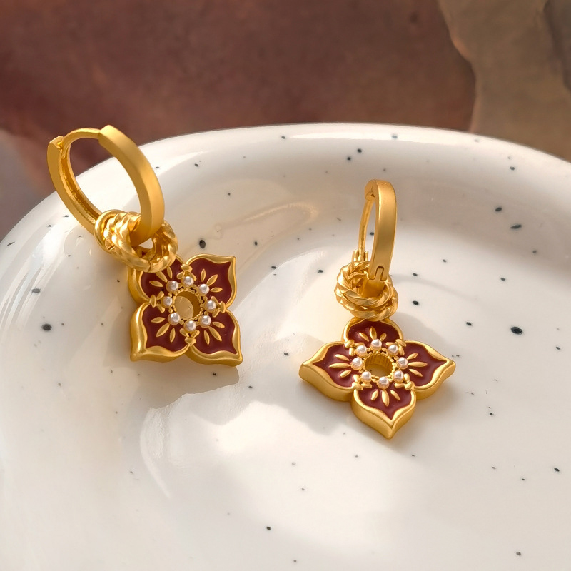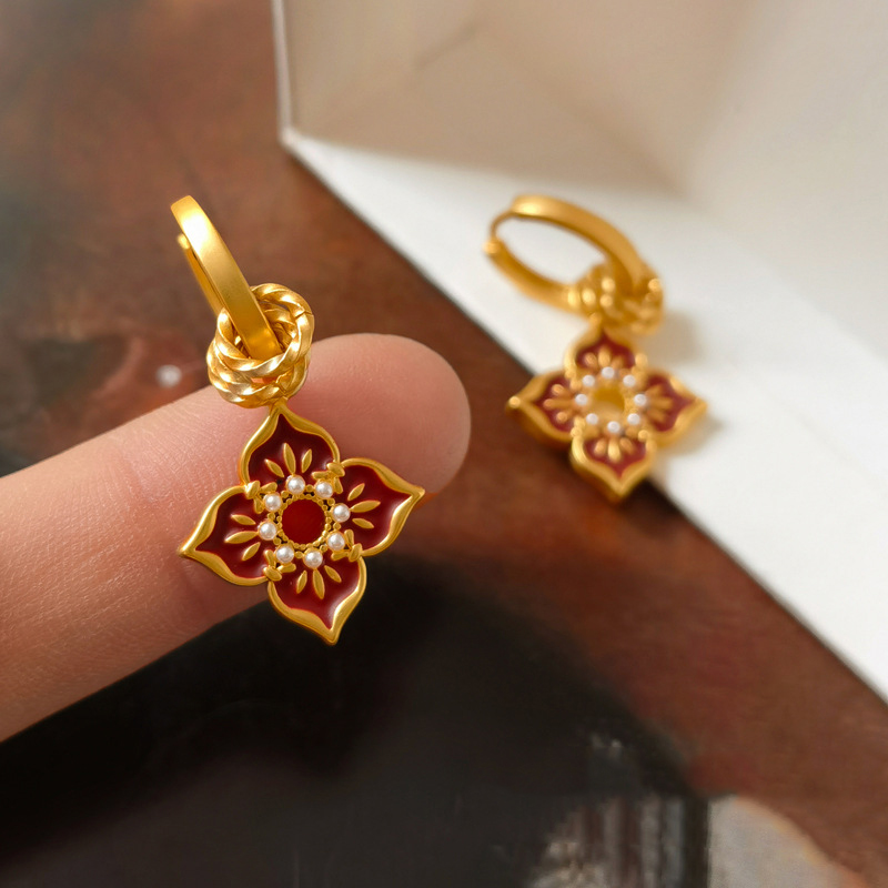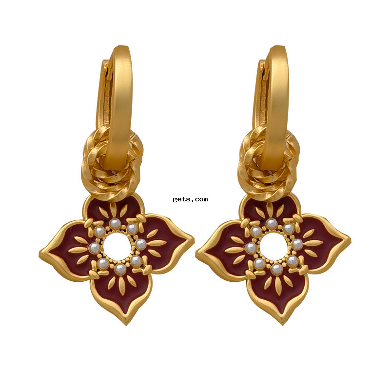 Huggie Hoop Drop Ohrringe, Messing, mit Kunststoff Perlen, goldfarben plattiert, für Frau & Emaille, rot, 16x31mm, verkauft von Paar