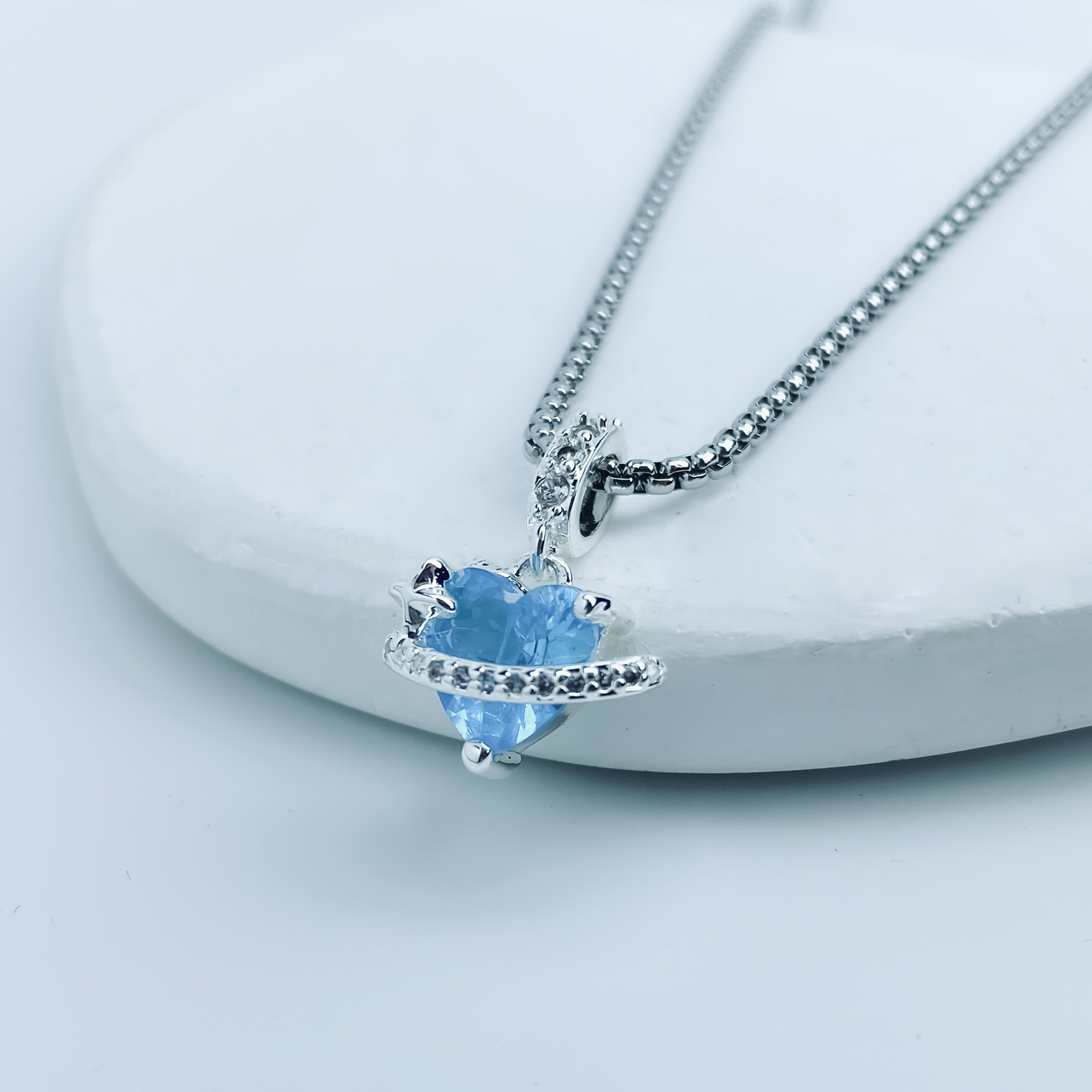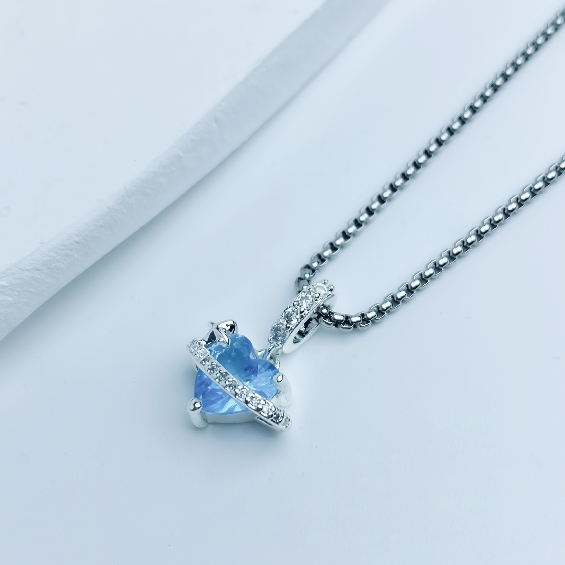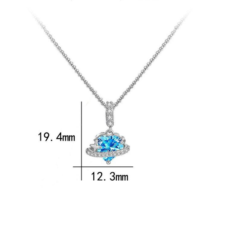Messing Halskette, mit Edelstahl Kette, mit Verlängerungskettchen von 5cm, Herz, silberfarben plattiert, Kastenkette & für Frau & mit Strass, blau, 12.30x19.40mm, verkauft per ca. 45 cm Strang