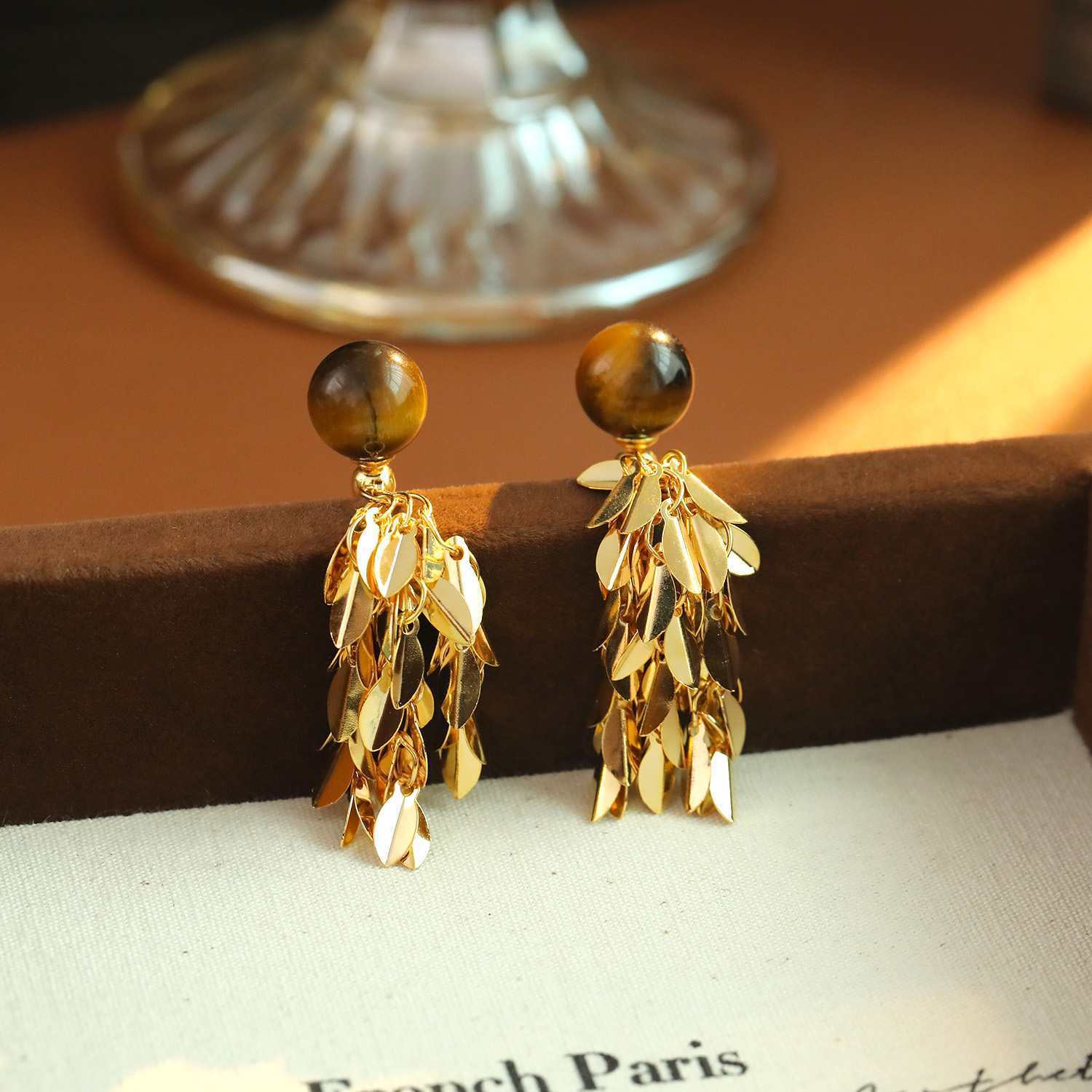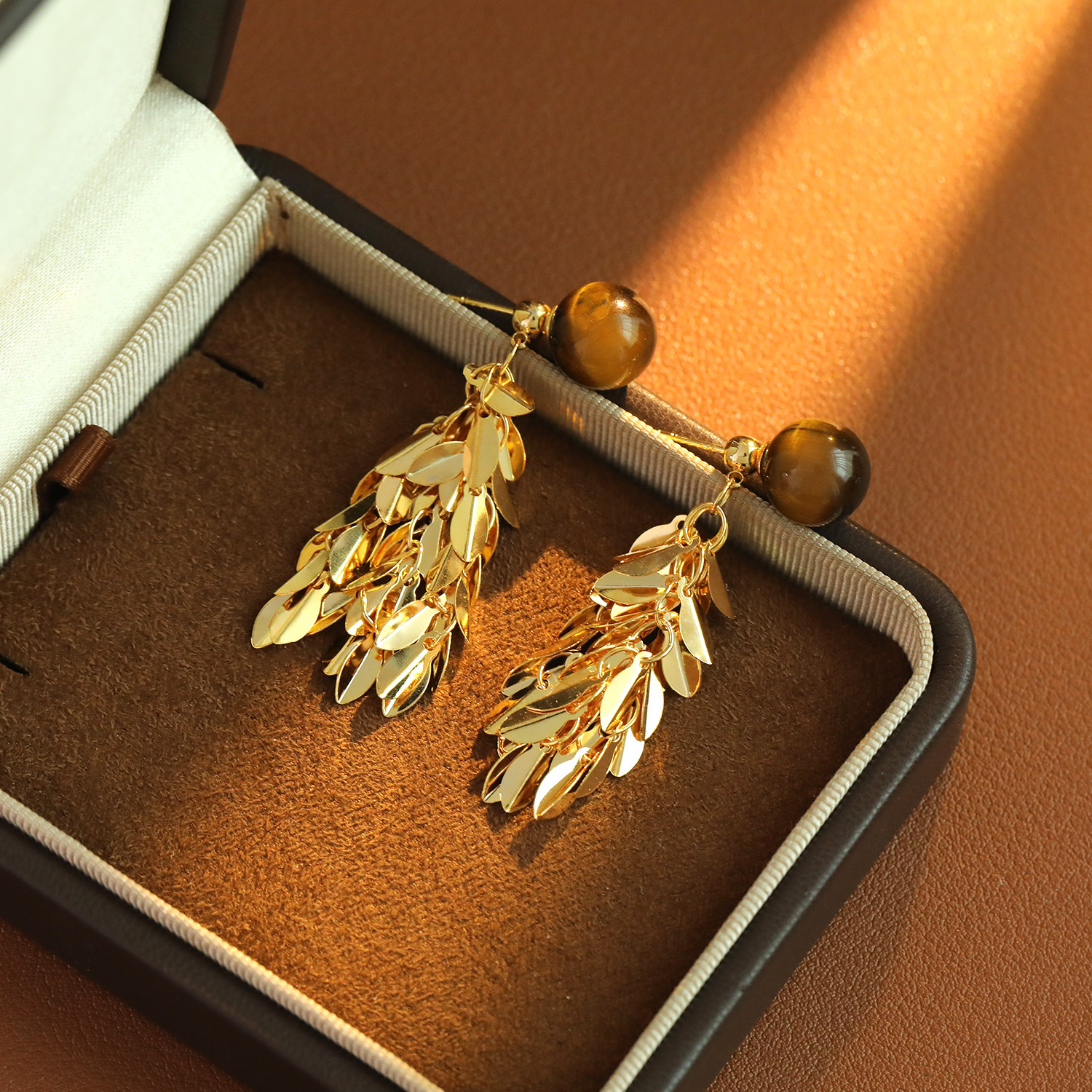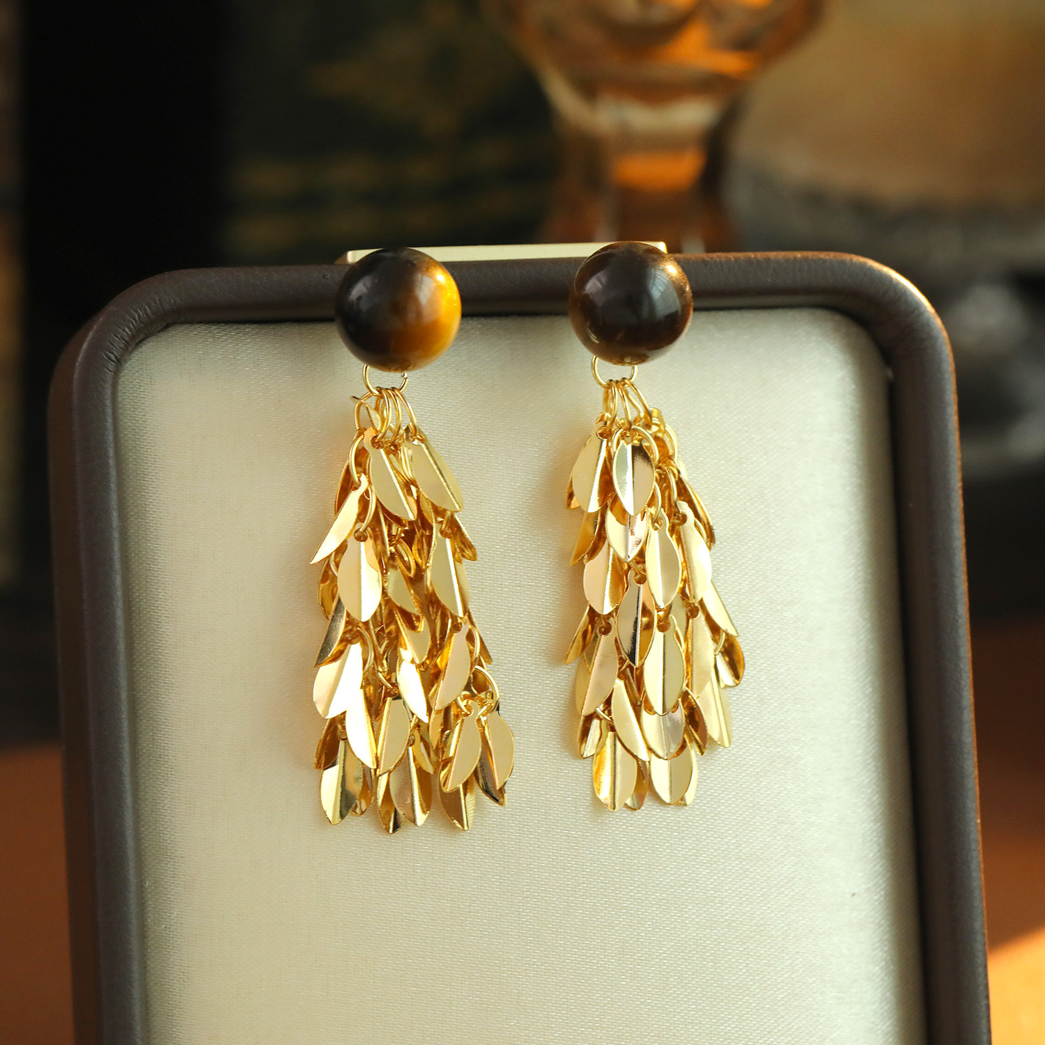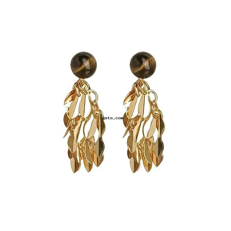 Messing Tropfen Ohrringe, mit Tigerauge, Blatt, 18K vergoldet, Modeschmuck & für Frau, 26x20mm, verkauft von Paar