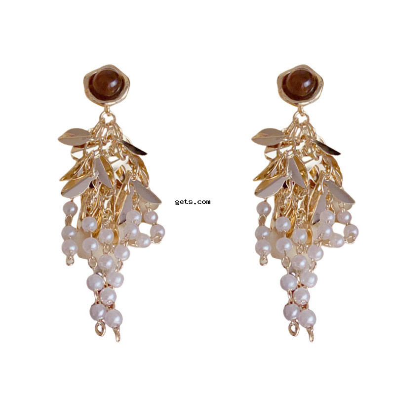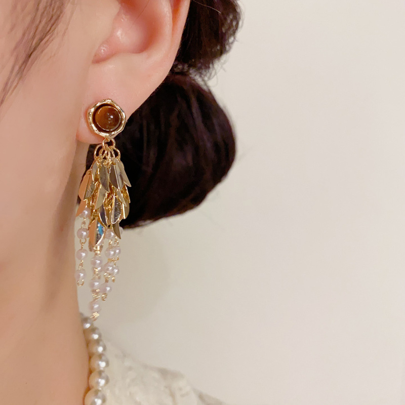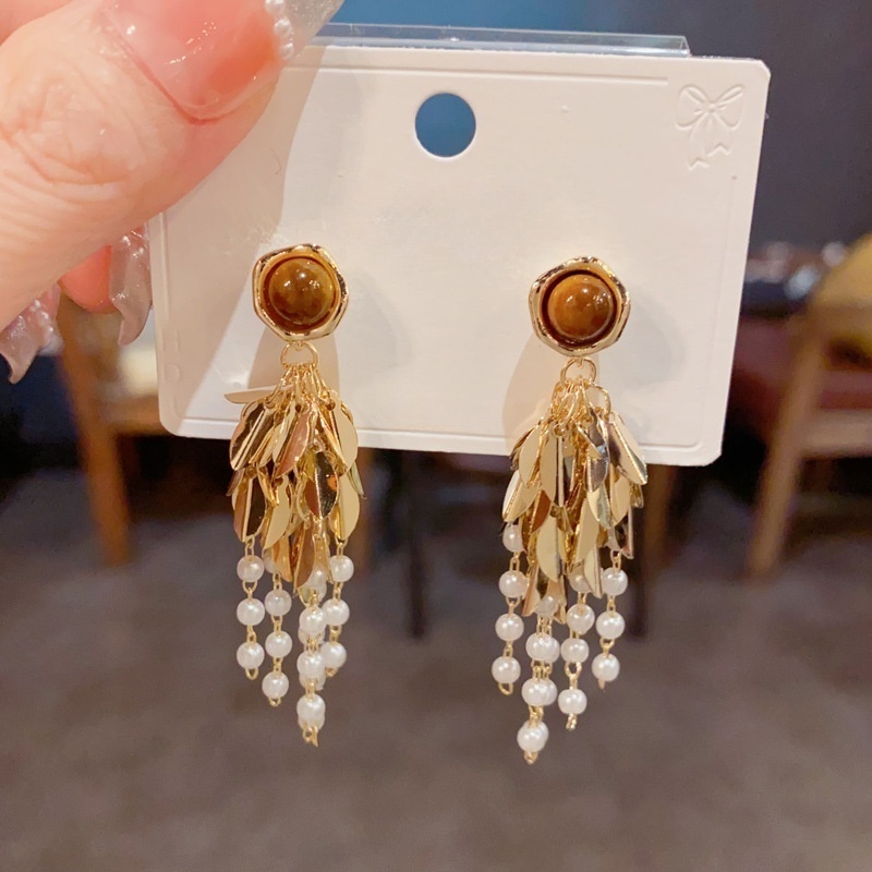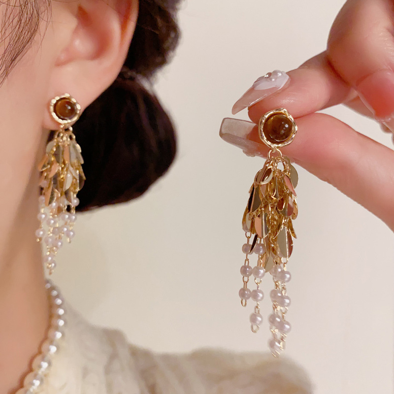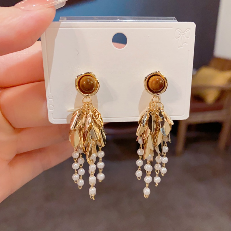 Messing Tropfen Ohrringe, mit Katzenauge & Kunststoff Perlen, vergoldet, Modeschmuck & für Frau, 58x15mm, verkauft von Paar