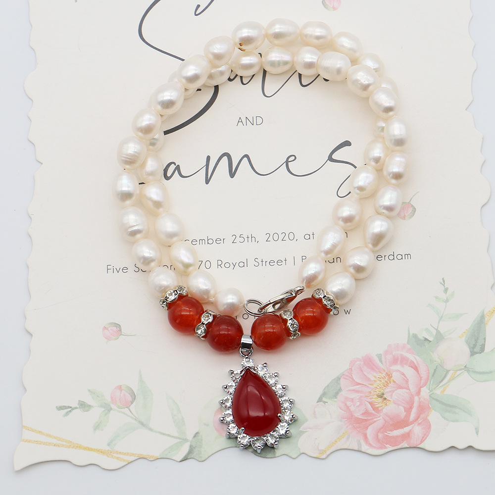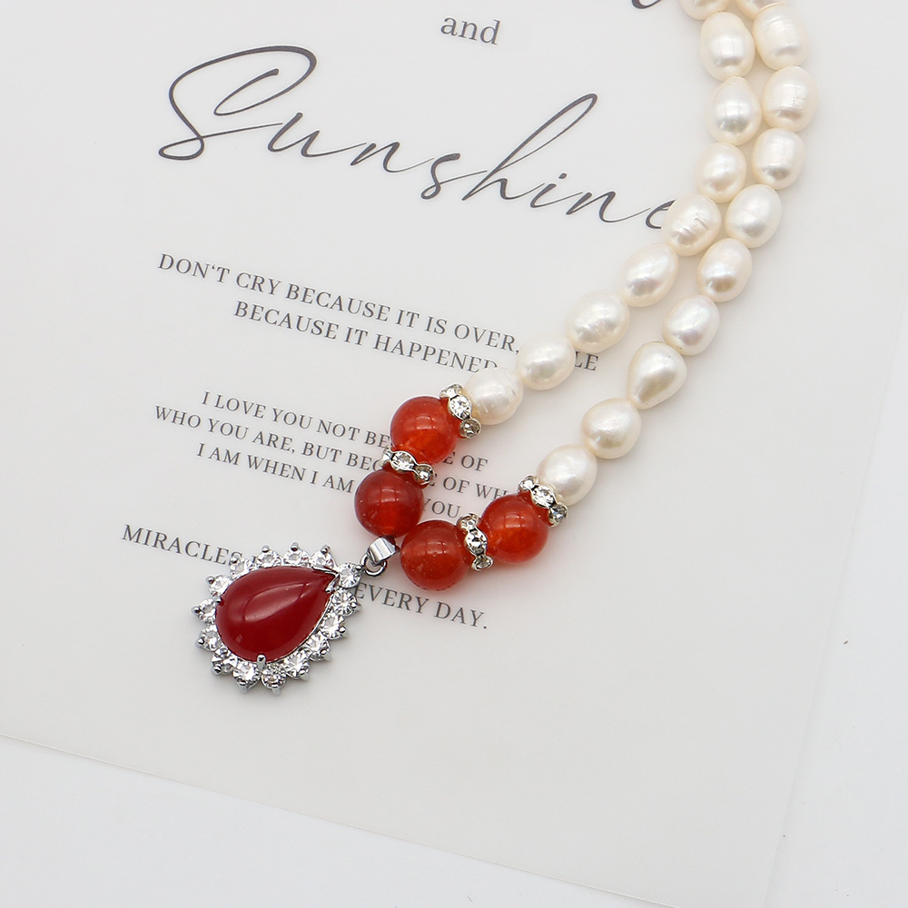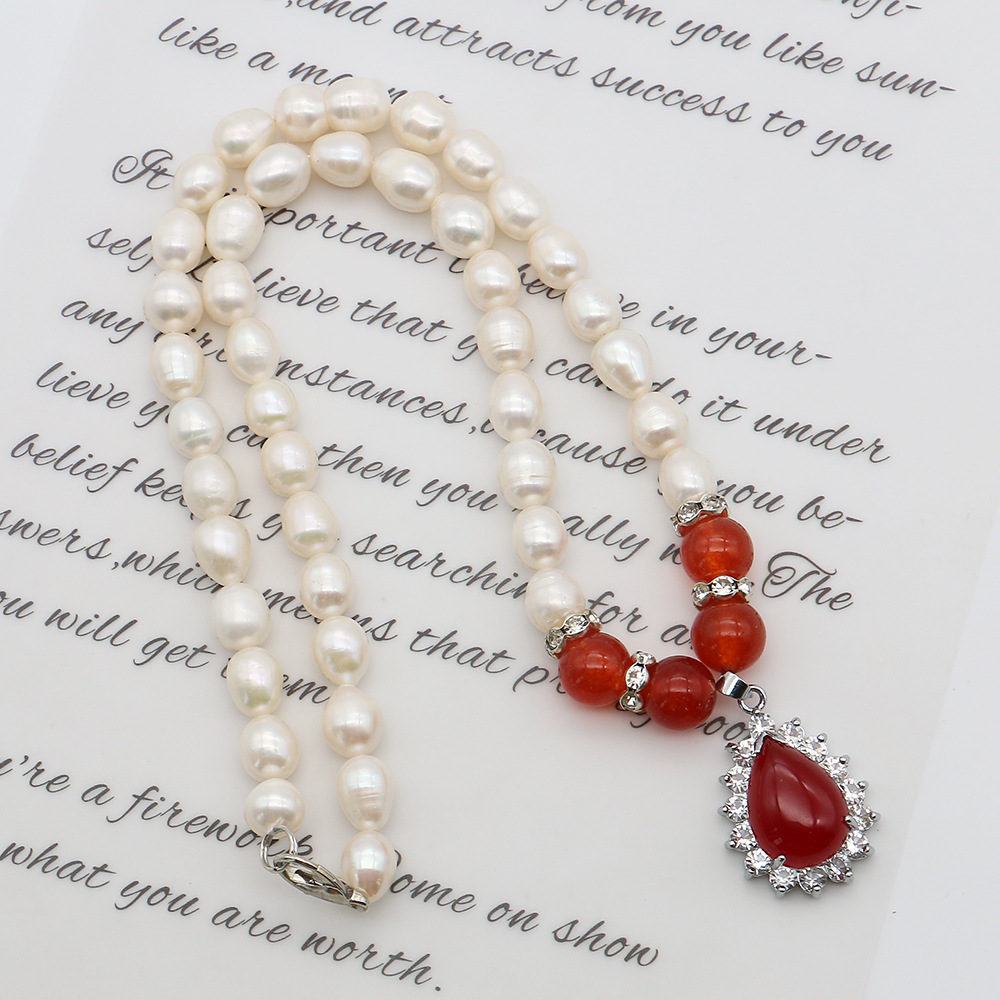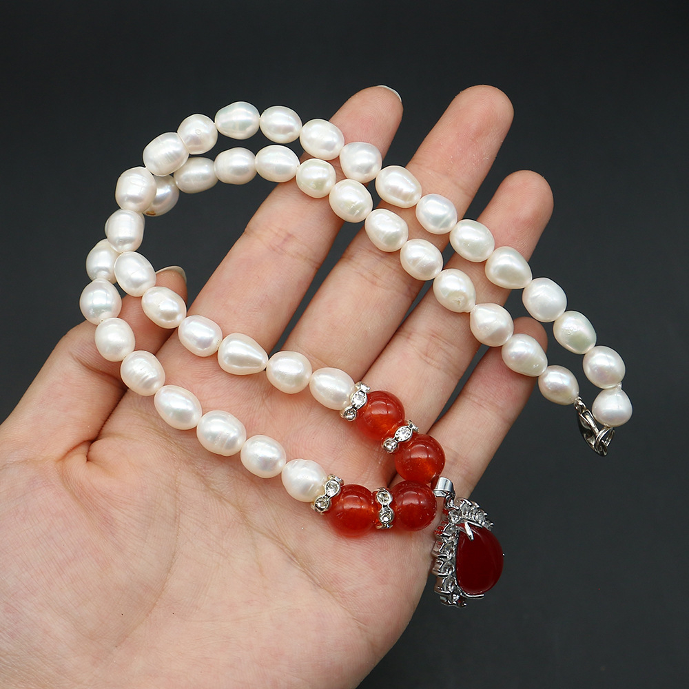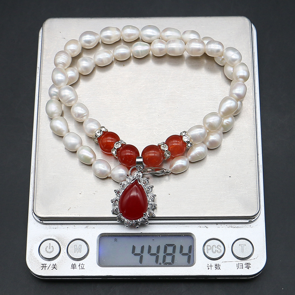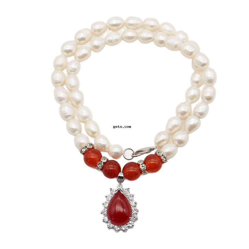 Natürliche Süßwasserperlen Halskette, Natürliche kultivierte Süßwasserperlen, mit Roter Achat & 304 Edelstahl & Zinklegierung, Reis, Modeschmuck & Micro pave Zirkonia, gemischte Farben, 8-9mm, verkauft per 44 cm Strang