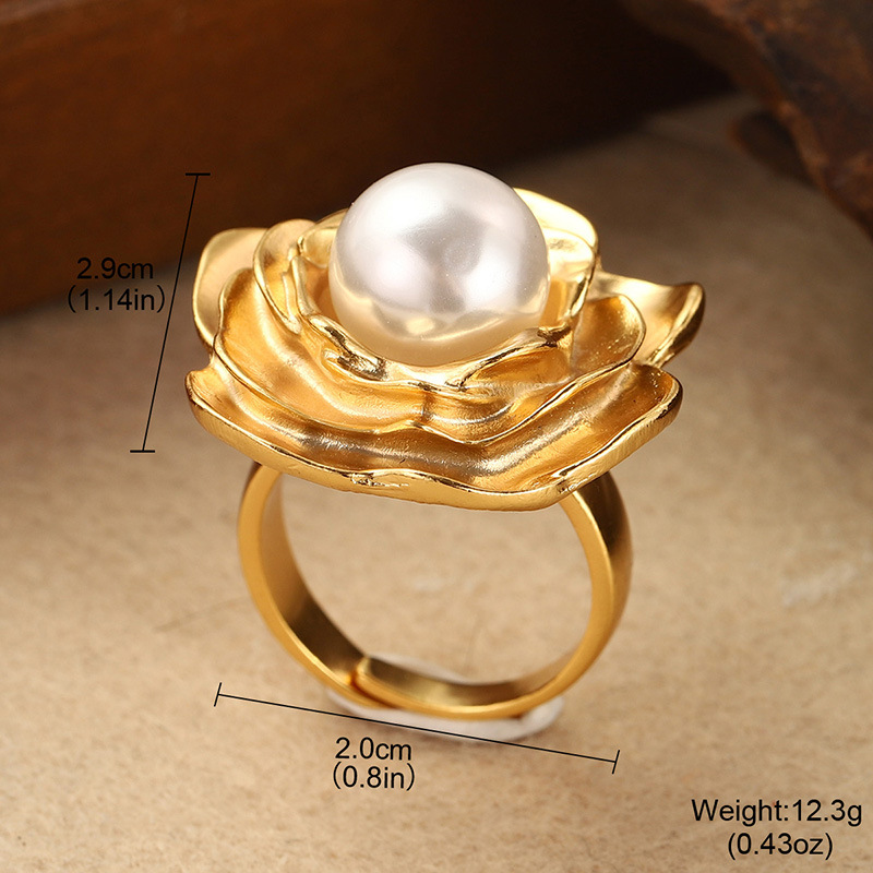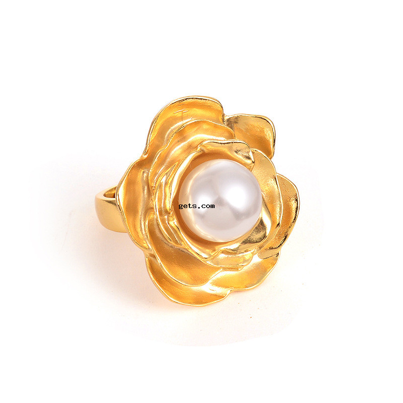 Anillo de dedo de latón, metal, con Perlas plásticas, Flor, chapado, diferentes materiales para la opción & diferentes estilos para la opción & para mujer, dorado, Vendido por UD