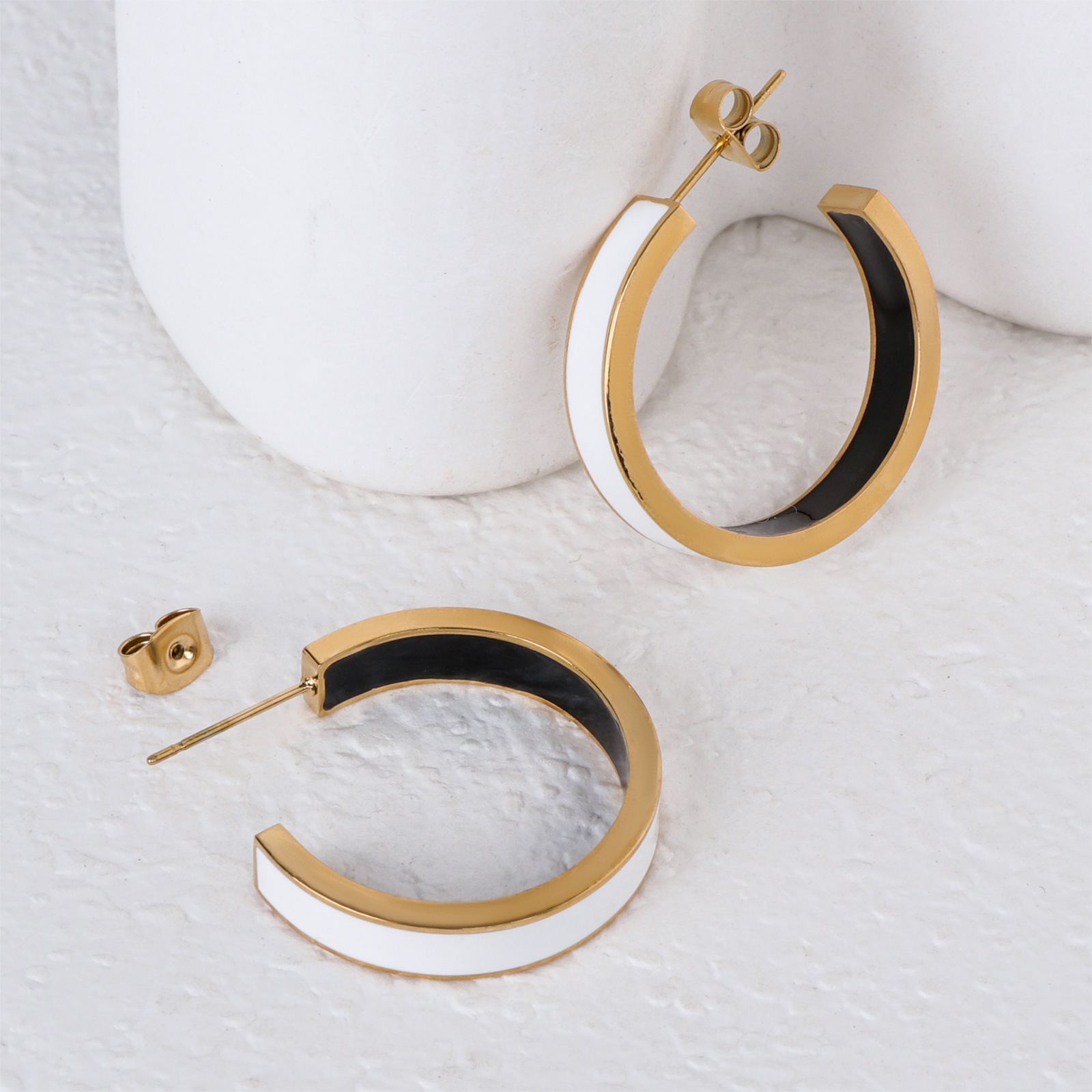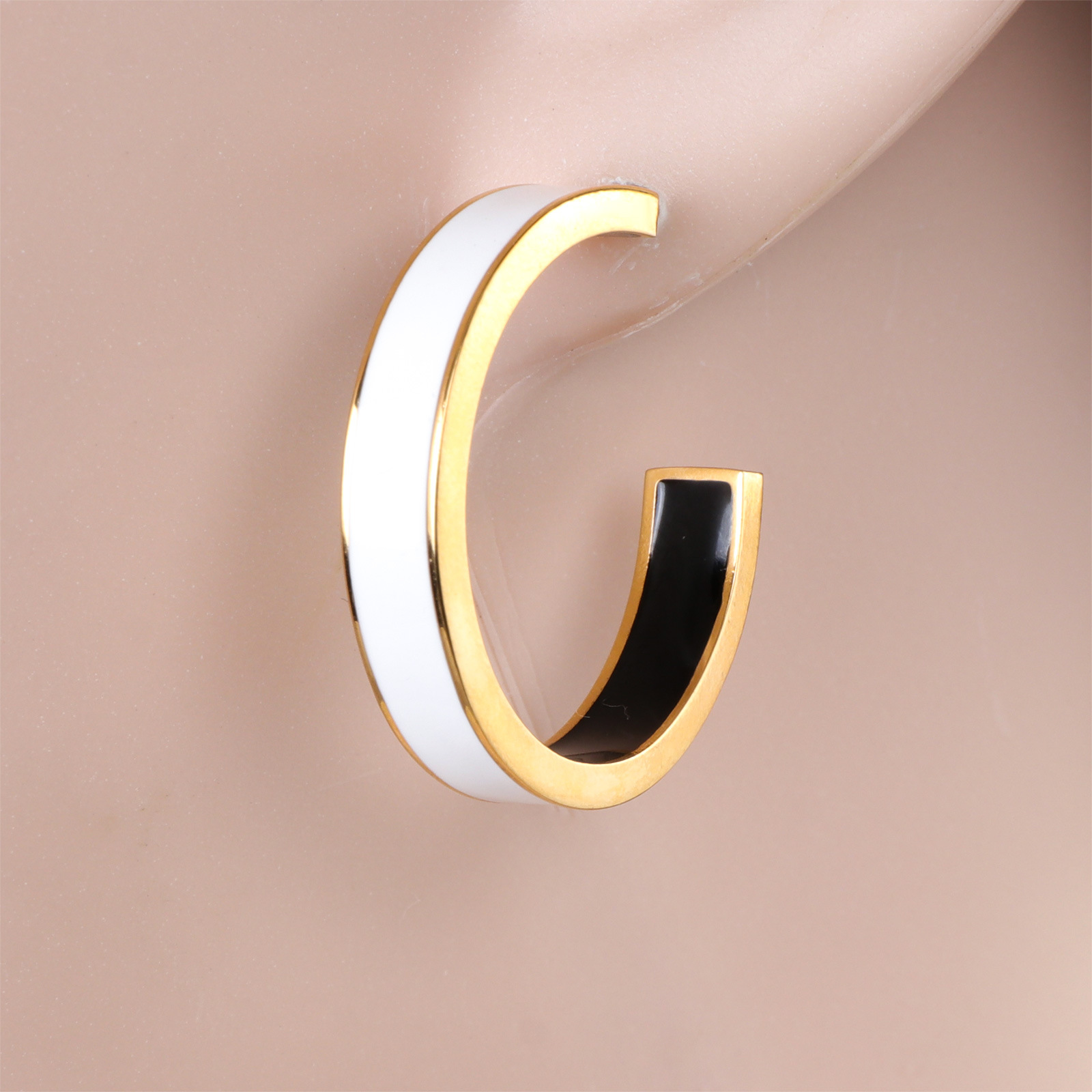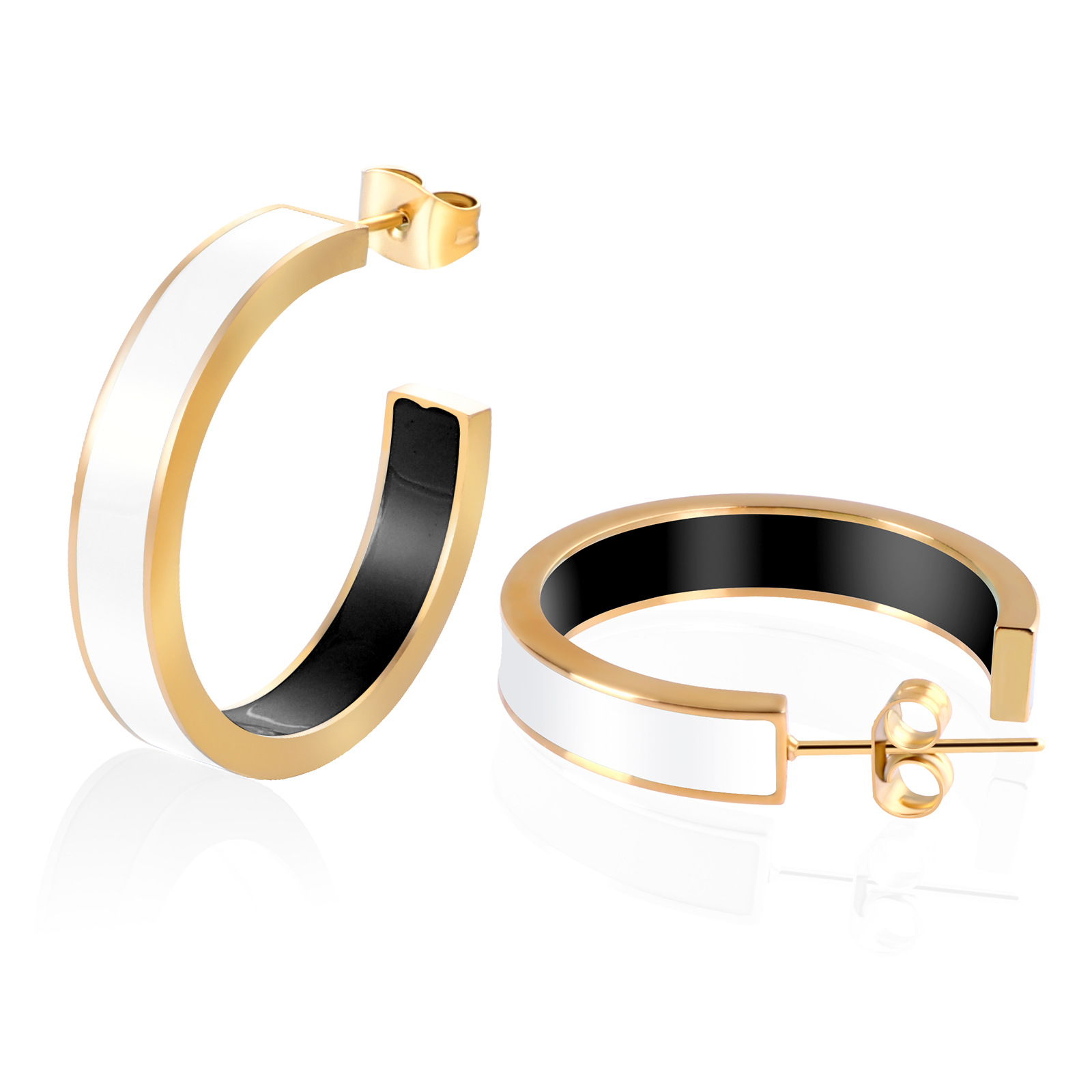 Boucle d'oreille de gaujon en acier inoxydable, Placage de couleur d'or, pour femme & émail, blanc et noir, 5x28mm, Vendu par paire