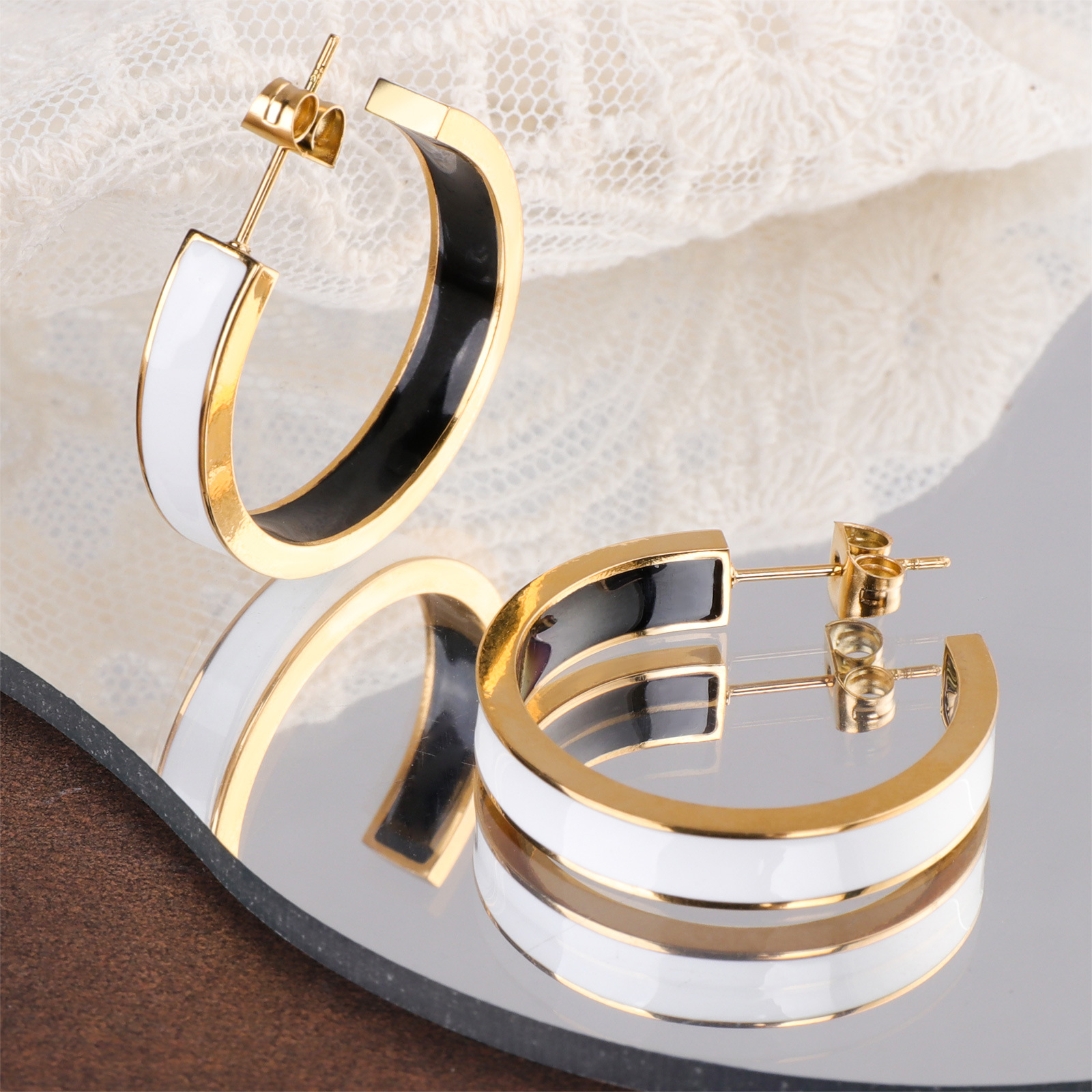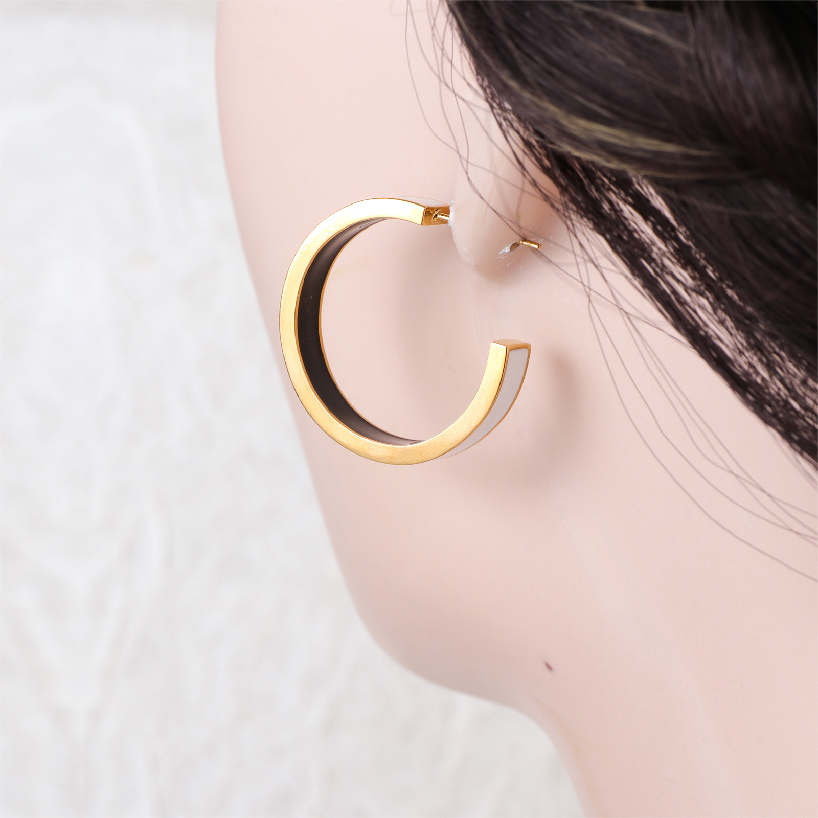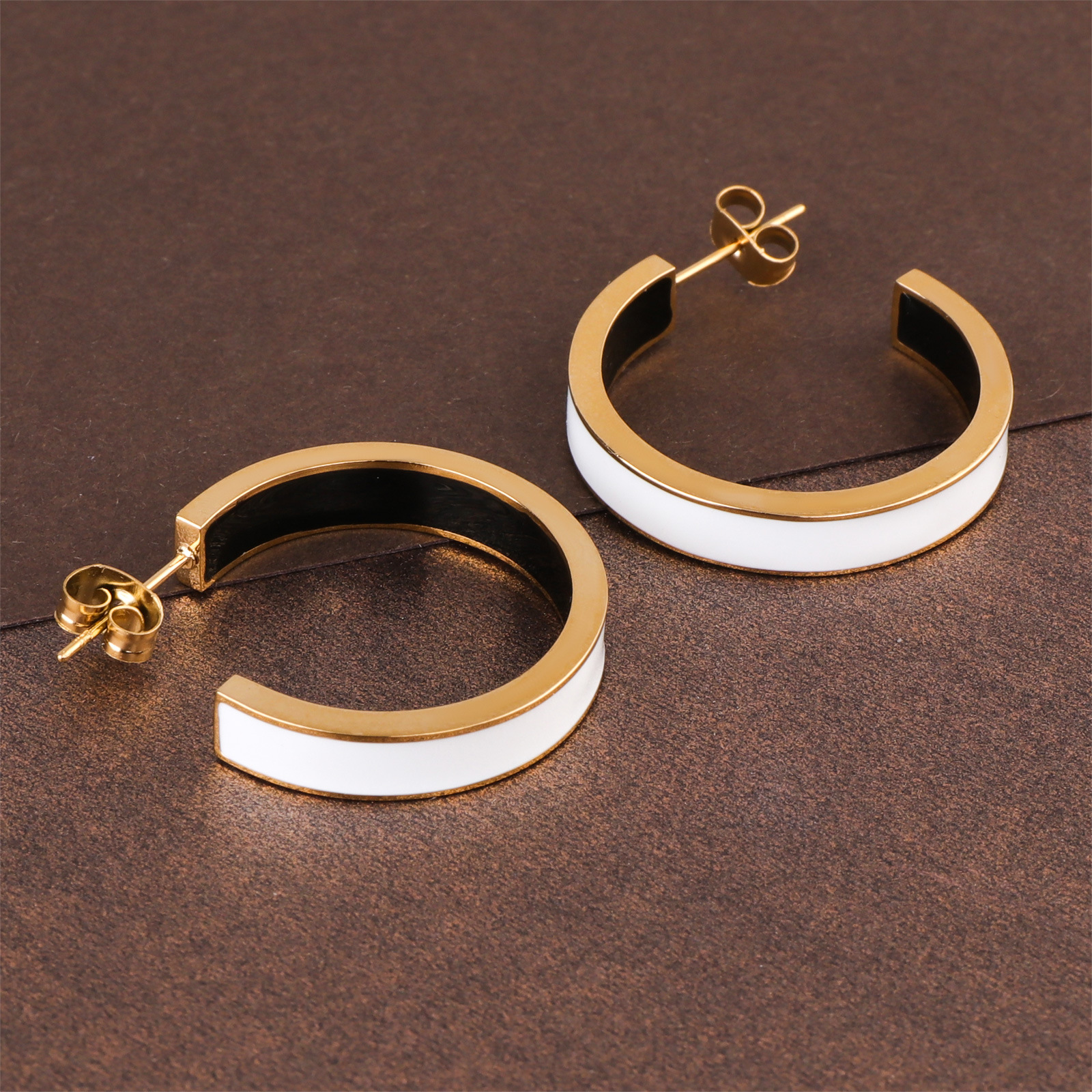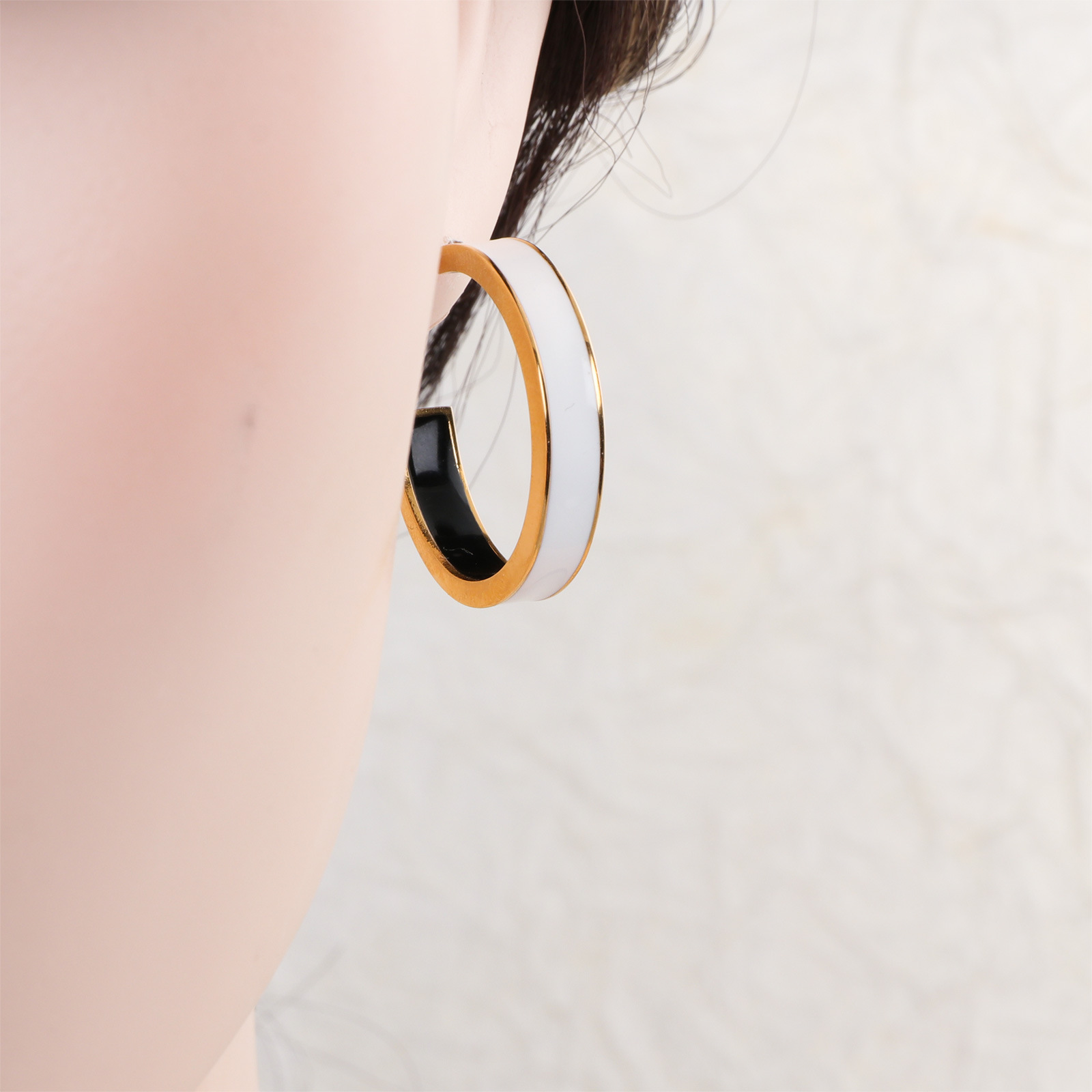 Boucle d'oreille de gaujon en acier inoxydable, Placage de couleur d'or, pour femme & émail, blanc et noir, 5x28mm, Vendu par paire