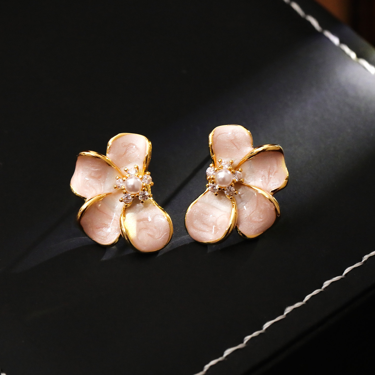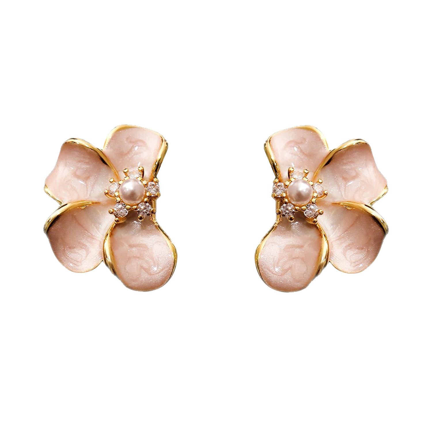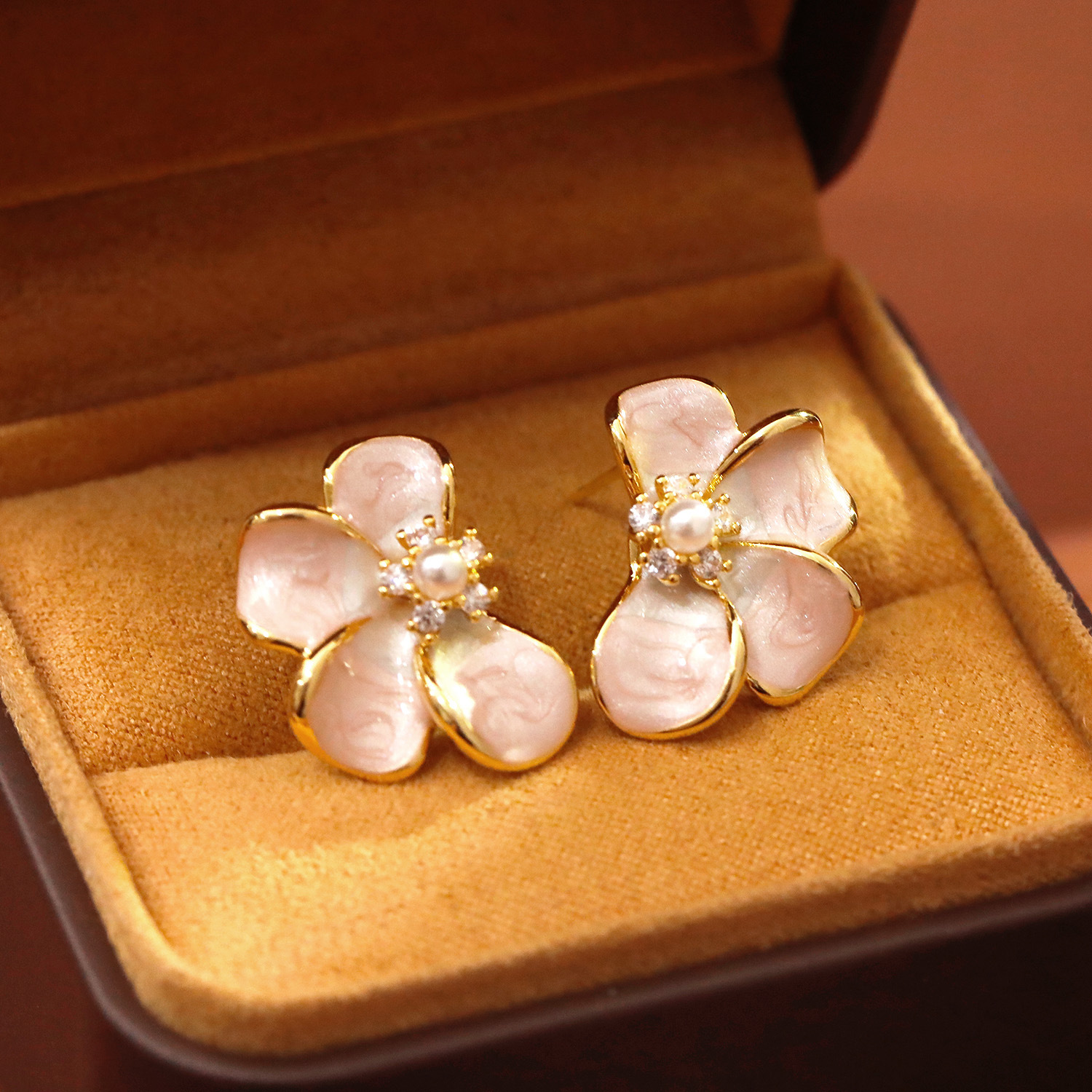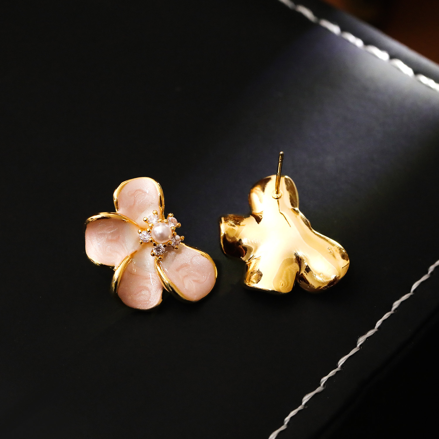 Boucles d'oreilles en laiton zircon cubique pavent, avec perle de plastique, fleur, Placage, pavé de micro zircon & pour femme & émail, doré, 21x15mm, Vendu par paire