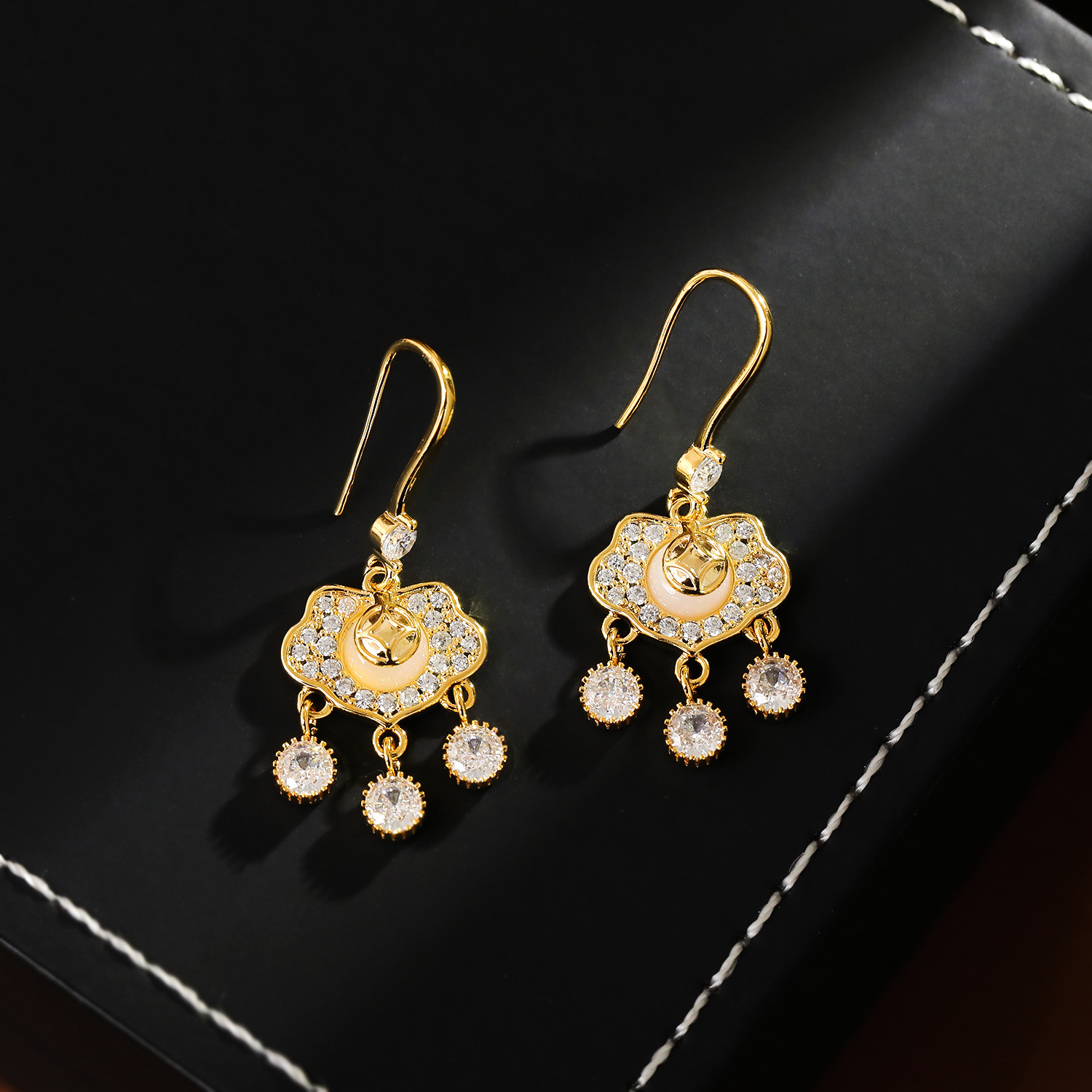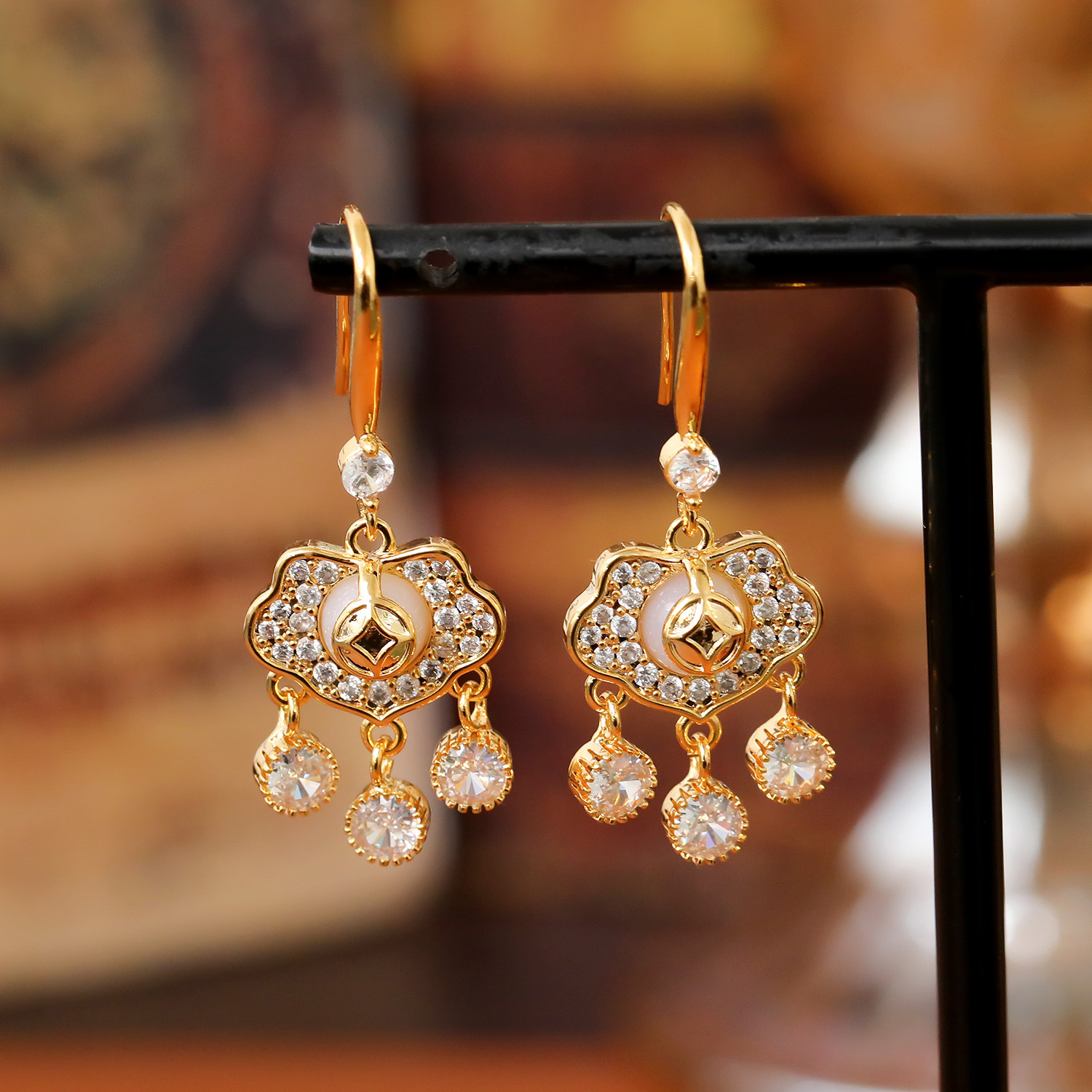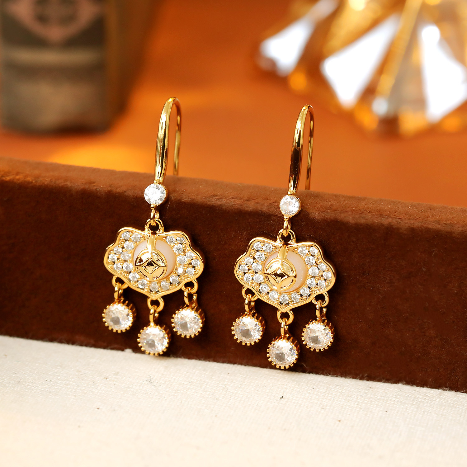 Boucles d'oreilles en laiton zircon cubique pavent, avec blanc calcédoine, Plaqué or 18K, bijoux de mode & pavé de micro zircon & pour femme, 26x20mm, Vendu par paire