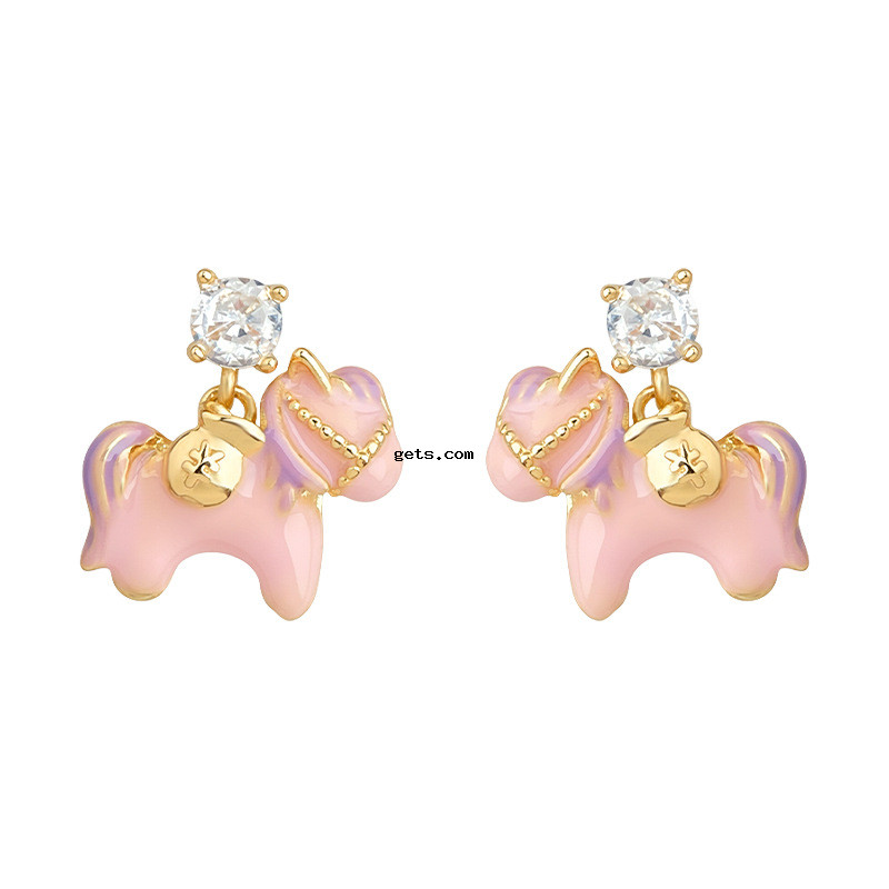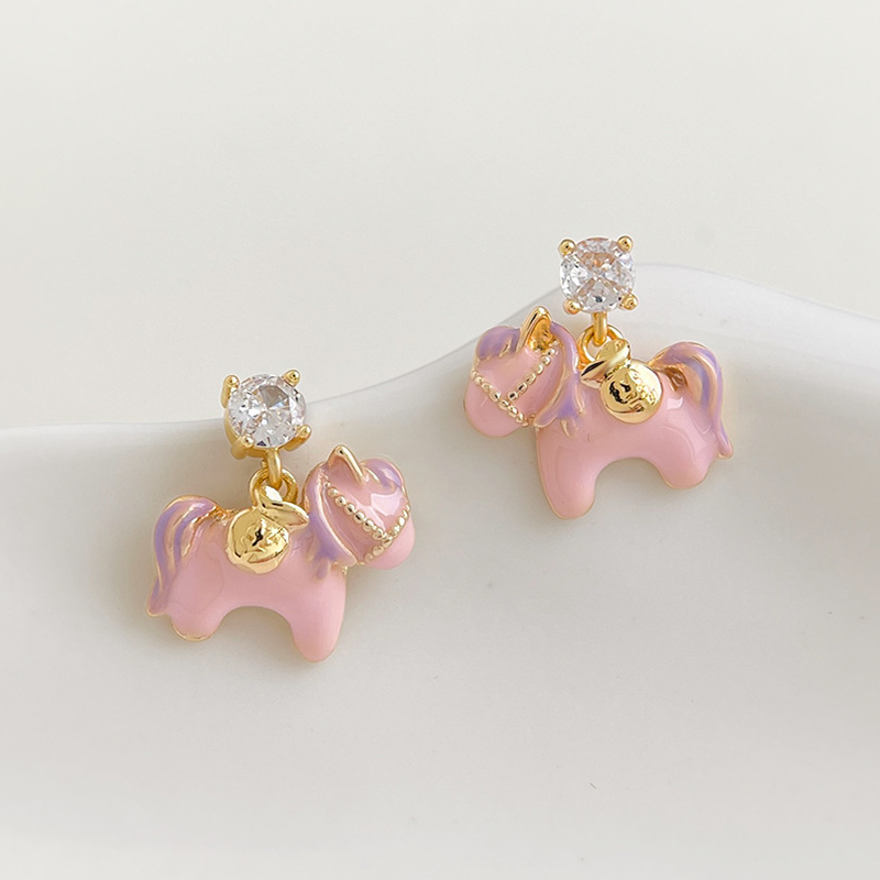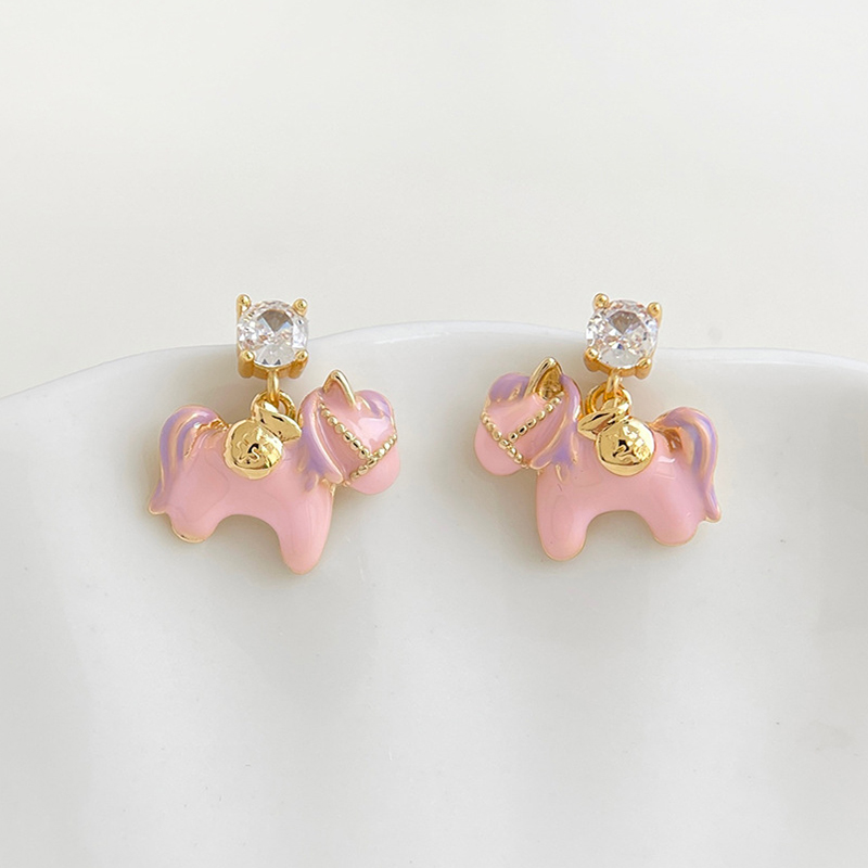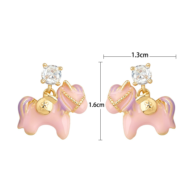 Boucles d'oreilles en laiton zircon cubique pavent, cheval, Placage de couleur d'or, pavé de micro zircon & pour femme & émail, rose, 13x16mm, Vendu par paire