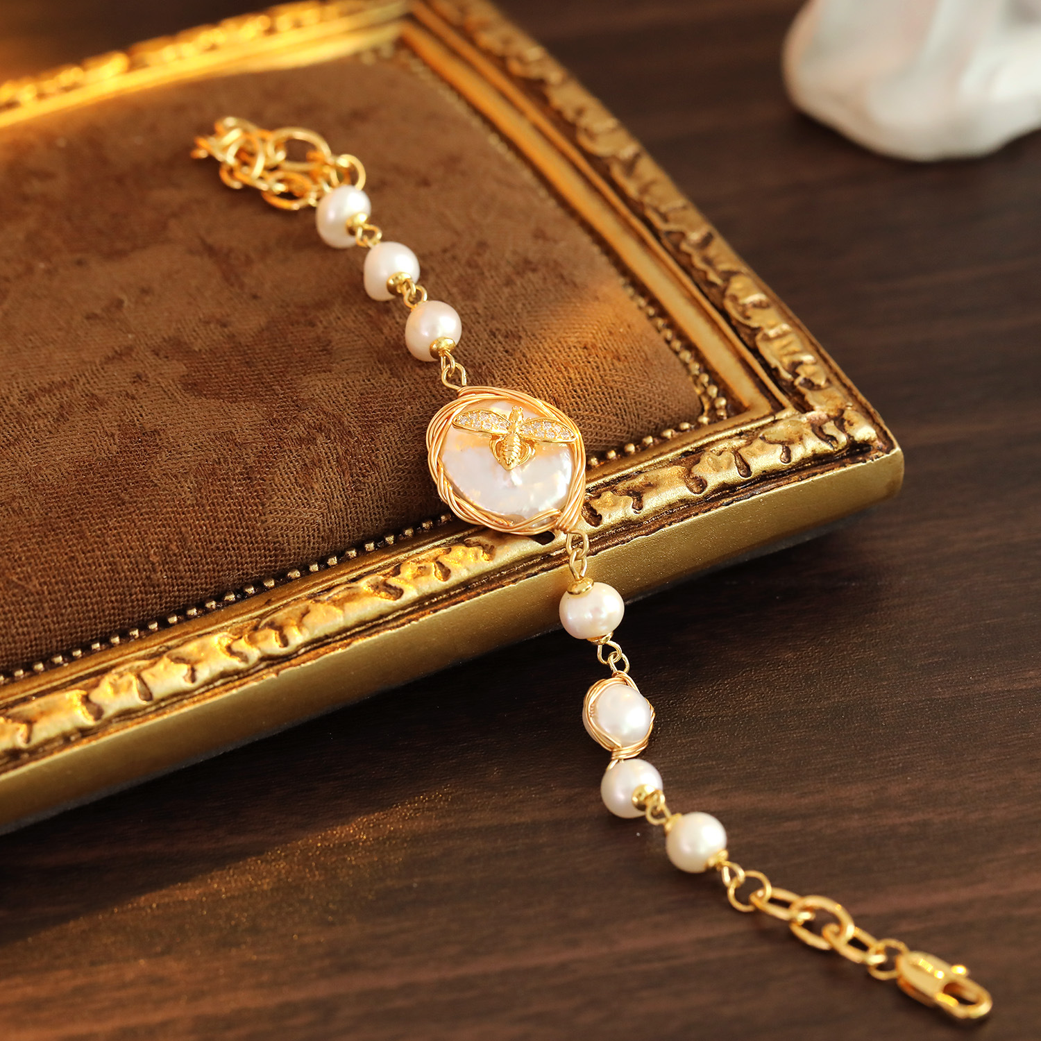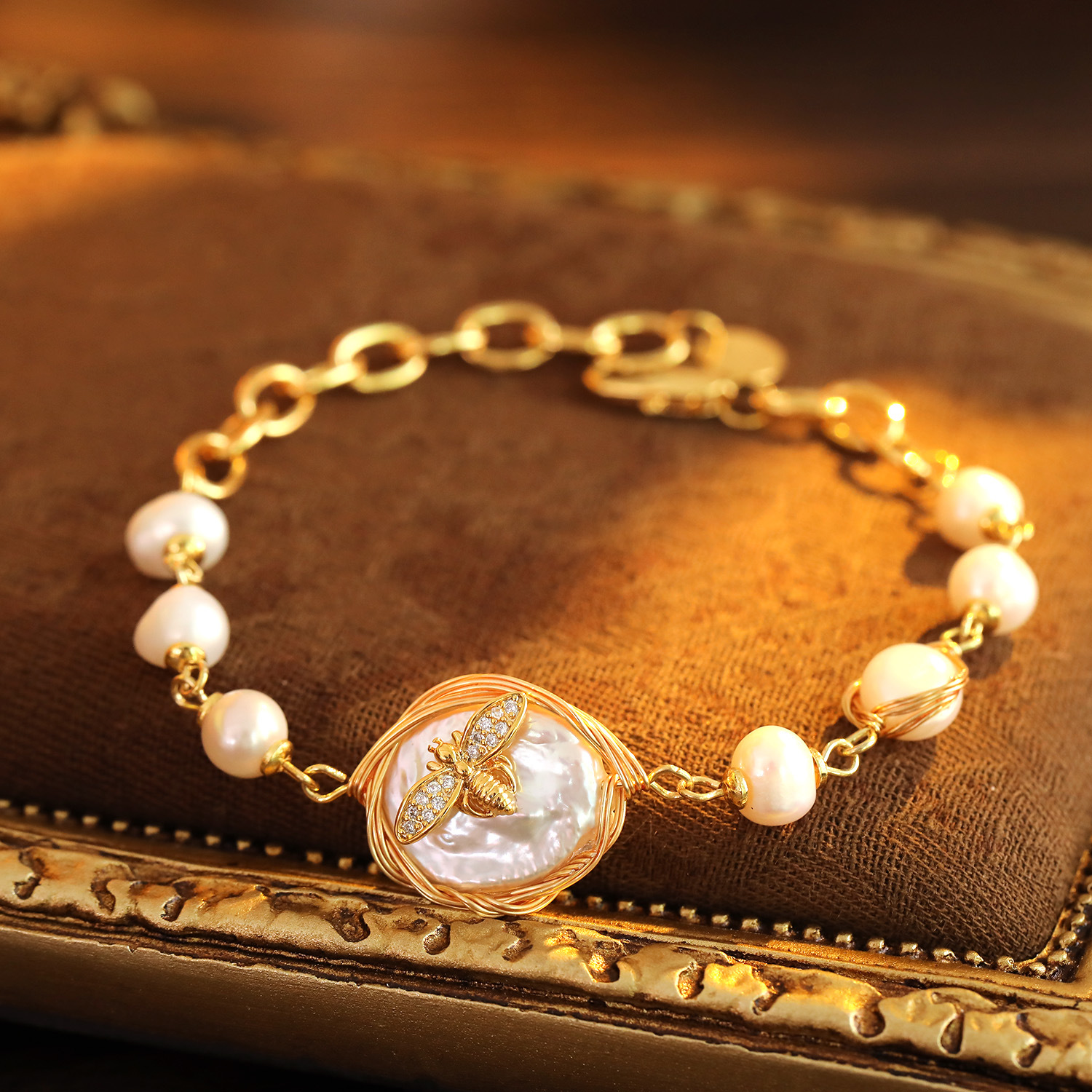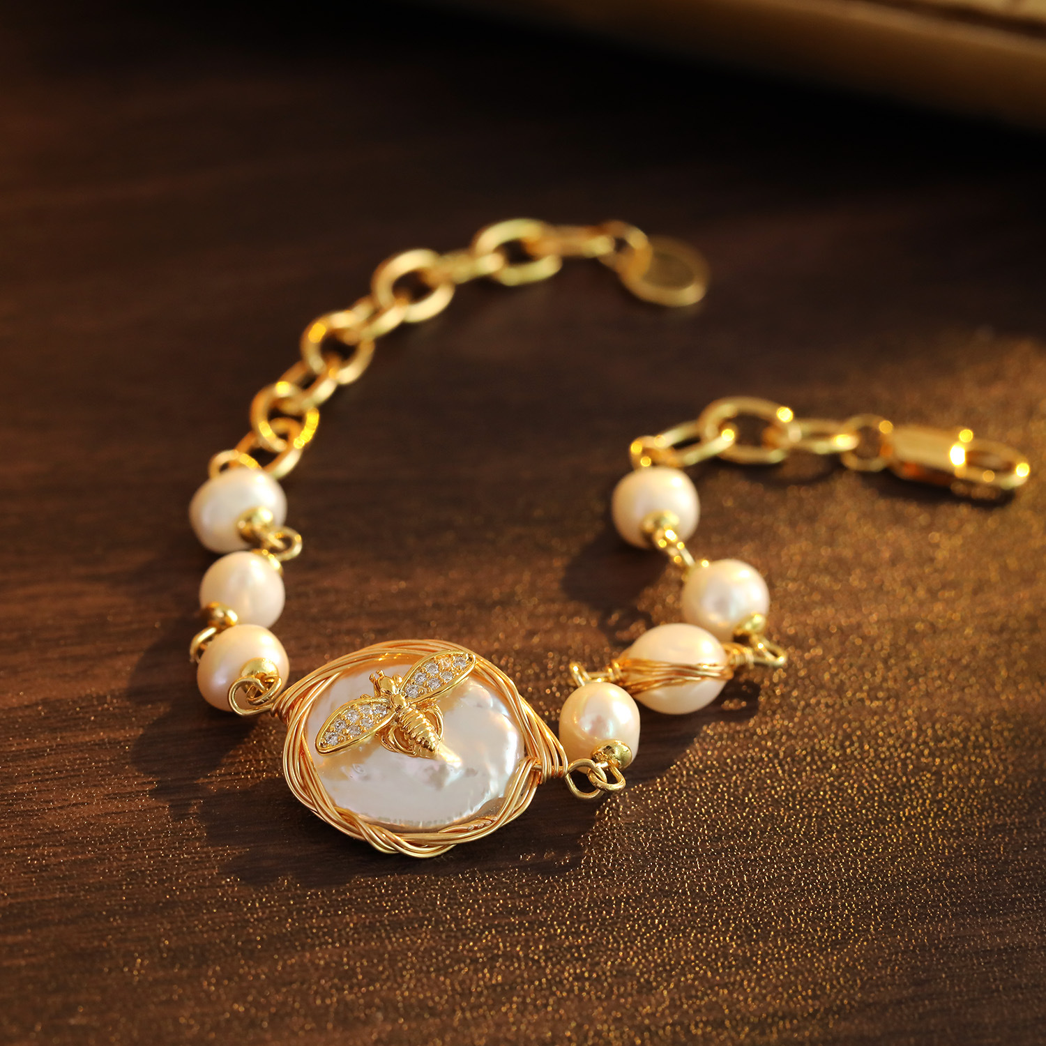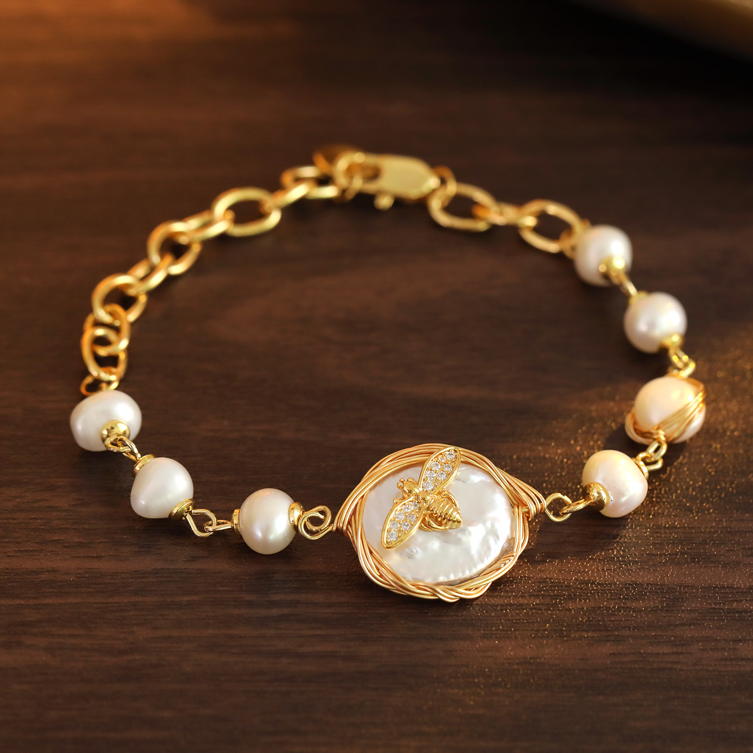 Bracelet en perles de culture d'eau douce, laiton, avec perle d'eau douce cultivée, avec 5cm chaînes de rallonge, abeille, Plaqué or 18K, bijoux de mode & pavé de micro zircon & pour femme, Pearl 5-6mm; The pendant is 1.9cm long and 1.7cm wide, Longueur:15.5 cm, Vendu par PC