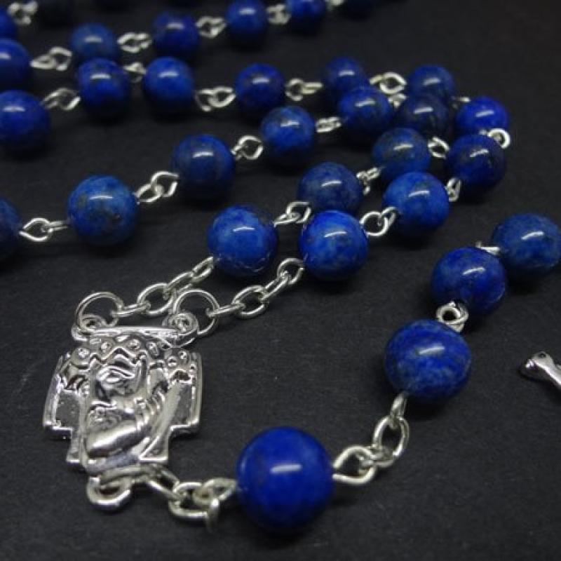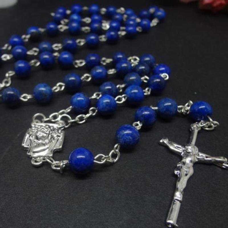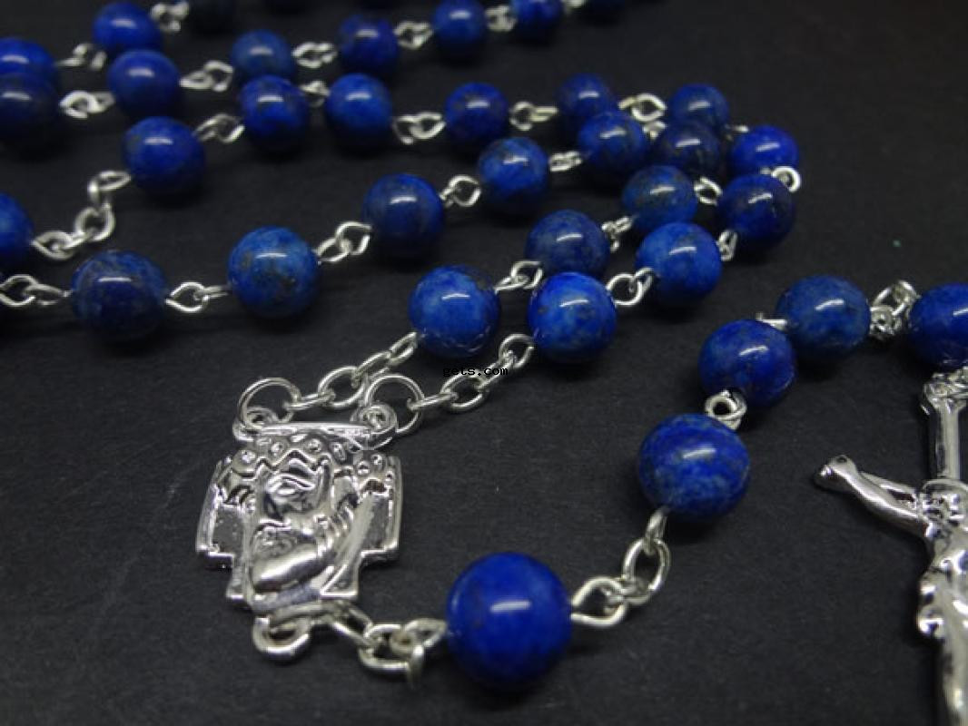 Collier de chapelet, alliage de zinc, avec Lapis lazuli, croix, Placage, bijoux de mode, couleurs mélangées, 8mm, Longueur:80 cm, Vendu par PC