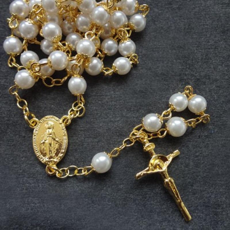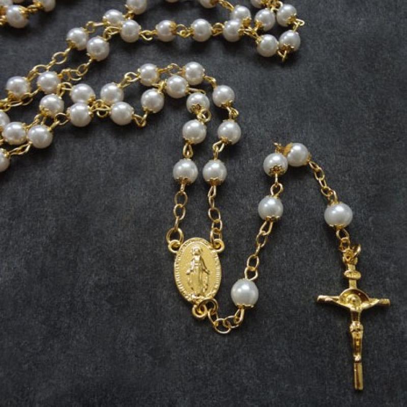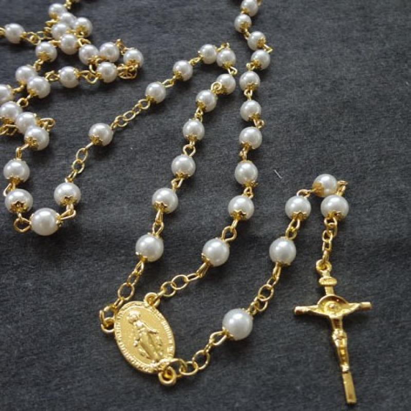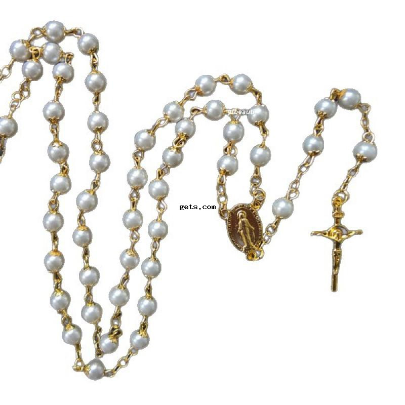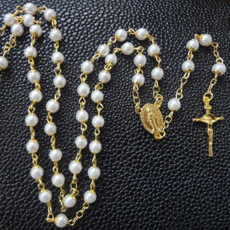 Collier de chapelet, alliage de zinc, avec Des billes de verre, croix, Placage de couleur d'or, bijoux de mode, couleurs mélangées, 6mm, Longueur:74 cm, Vendu par PC