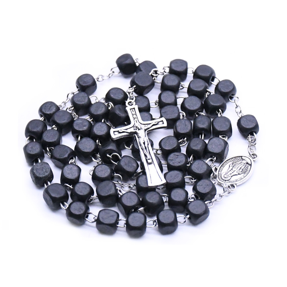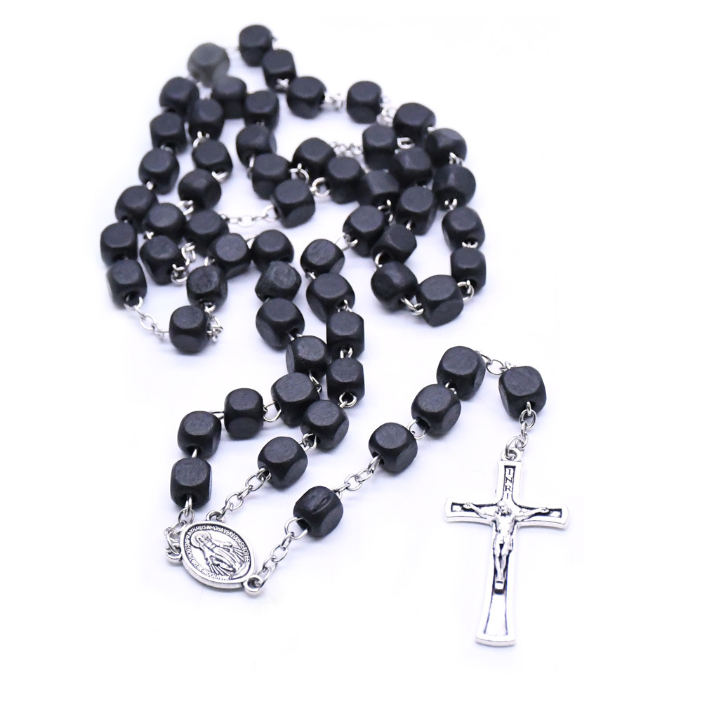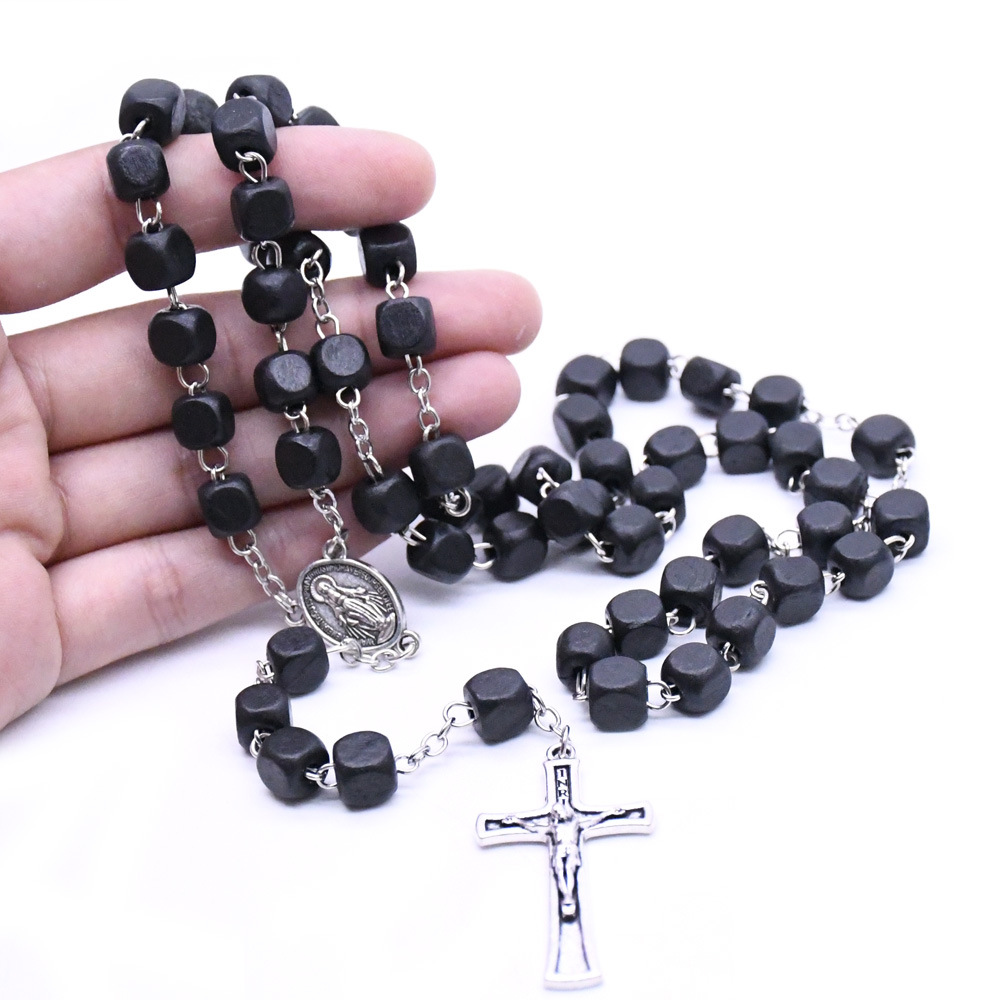 Collier de chapelet, alliage de zinc, avec Hemu-Perles, croix, Placage de couleur argentée, bijoux de mode, noire, 8mm, Longueur:52 cm, Vendu par PC