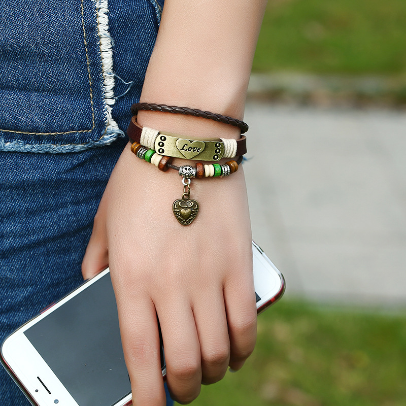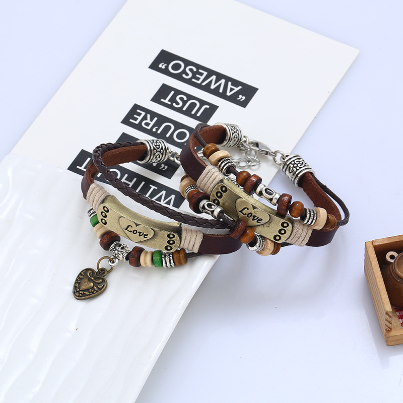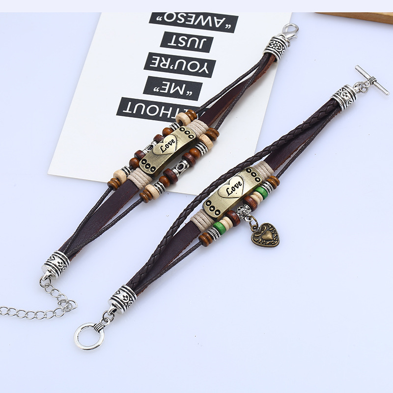 Cowhide Bracelet, Wax Cord, with Cowhide & Wood, gold color plated, fashion jewelry & multilayer, more colors for choice, 210x8mm, Length:21 cm, Sold By PC