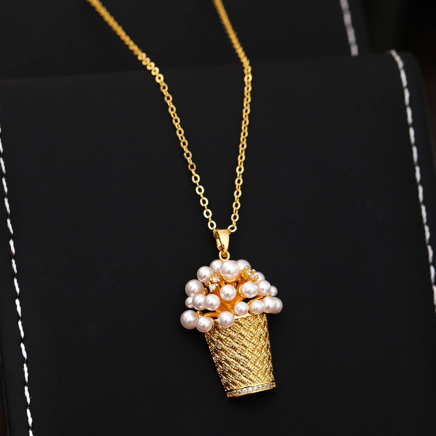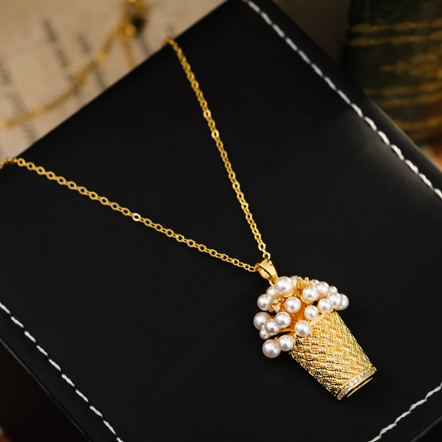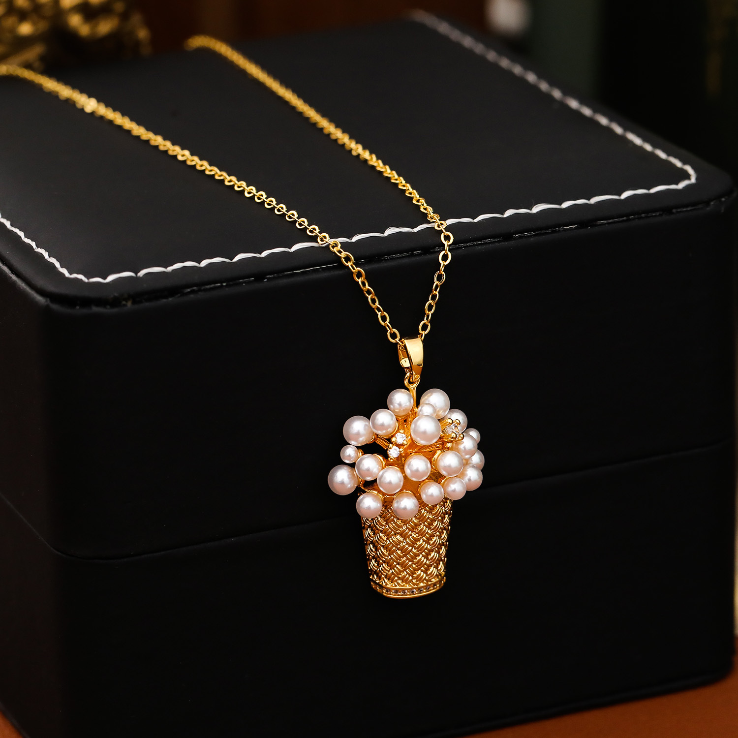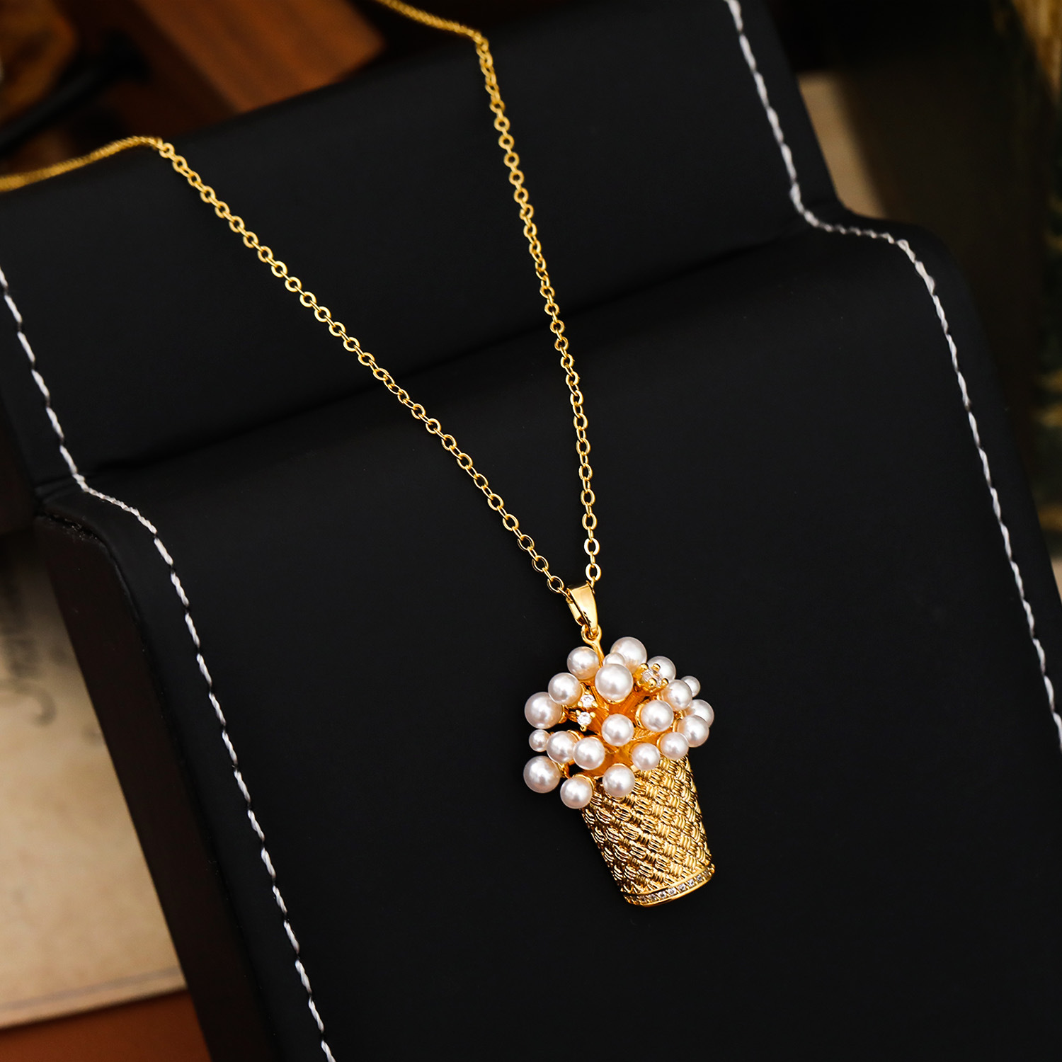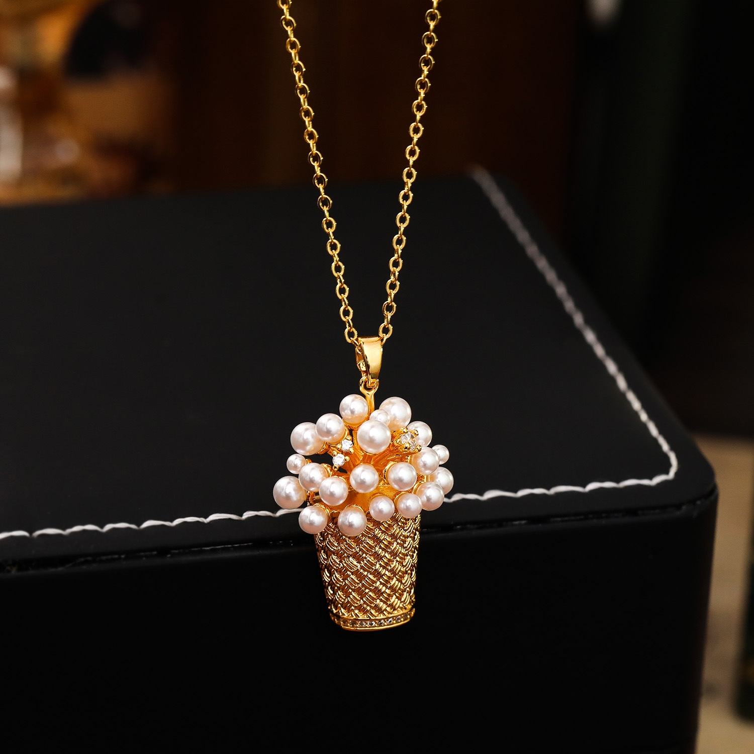 Cubic Zircon Micro Pave Brass Necklace, with Plastic Pearl, Flower Basket, 18K gold plated, fashion jewelry & micro pave cubic zirconia & for woman, The pendant is 3.6cm long and 2.1cm wide, Length:46 cm, Sold By PC