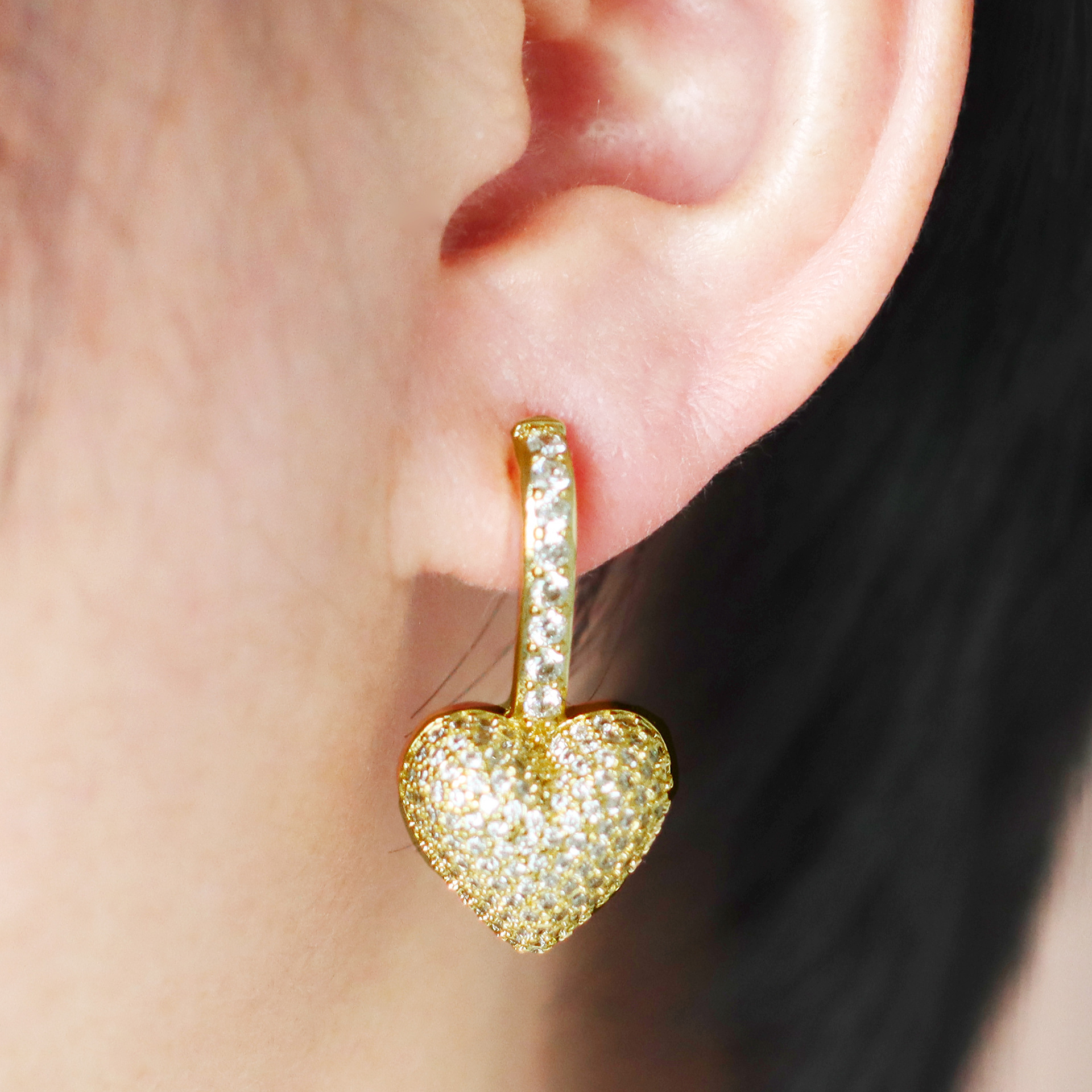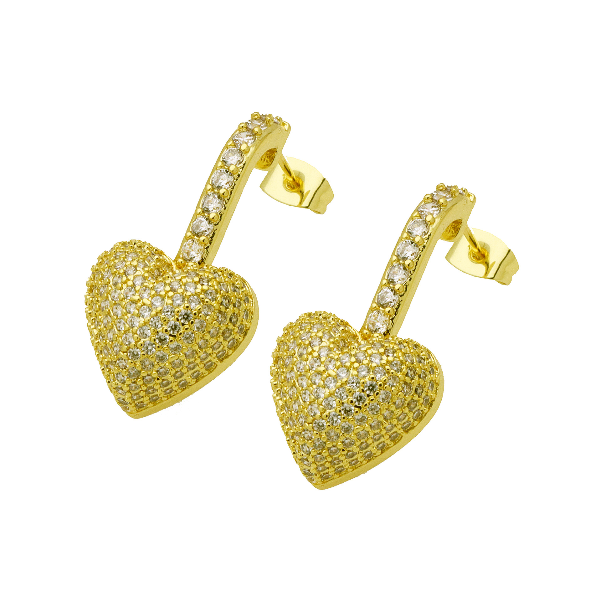 Cubic Zirconia Micro Pave Brass Earring, Heart, gold color plated