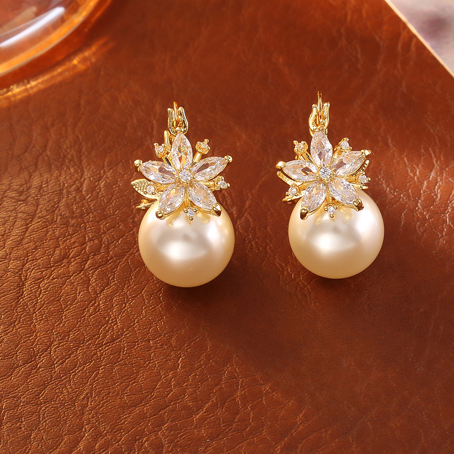 Cubic Zirconia Micro Pave Brass Earring, Flower, gold color plated