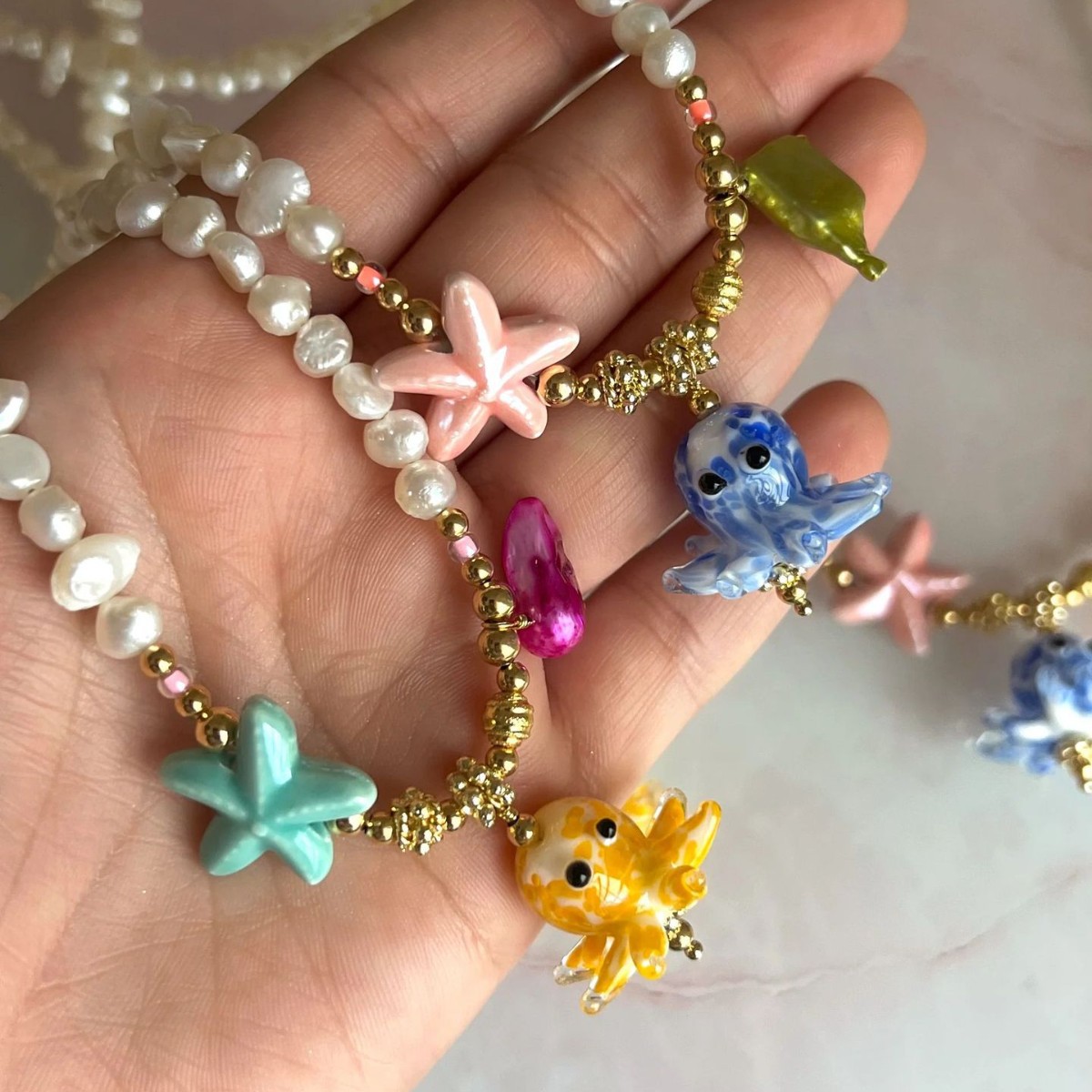 - Lampwork Necklace, with Natural Stone & Brass, gold color plated