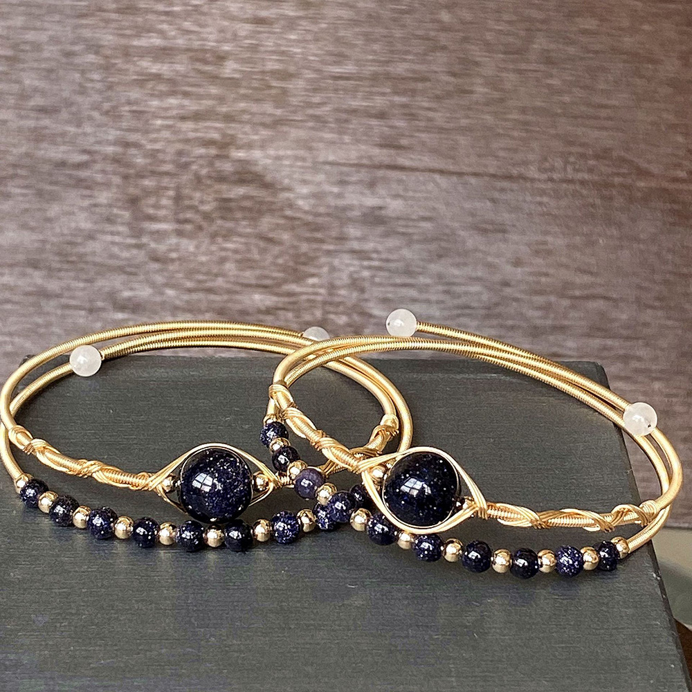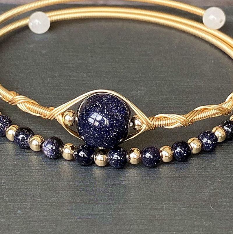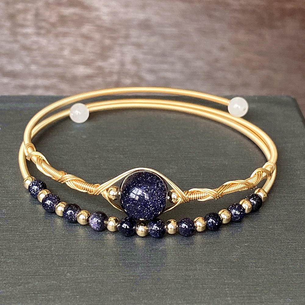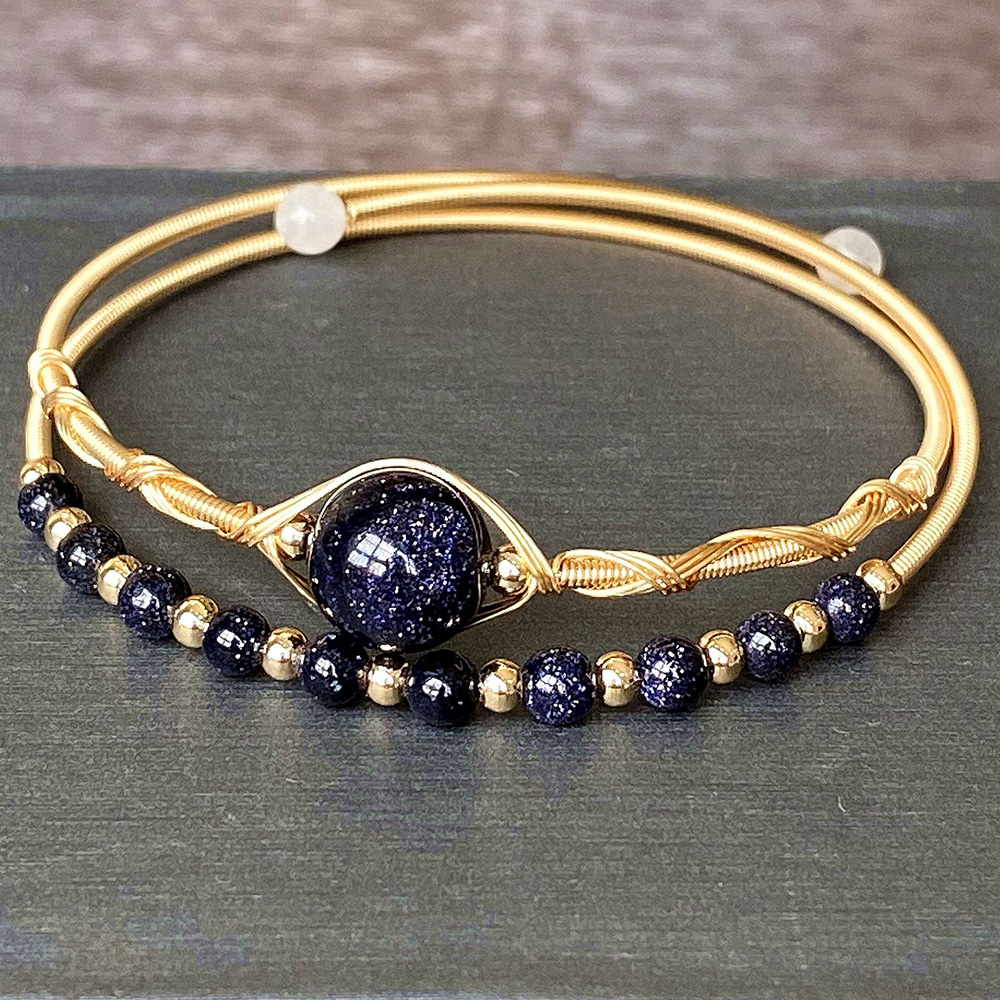 Natural Blue Goldstone Bracelets, Brass, with Blue Sandstone, 14K gold-filled, Double Layer & fashion jewelry & for woman, Inner diameter :55mm, Sold By PC