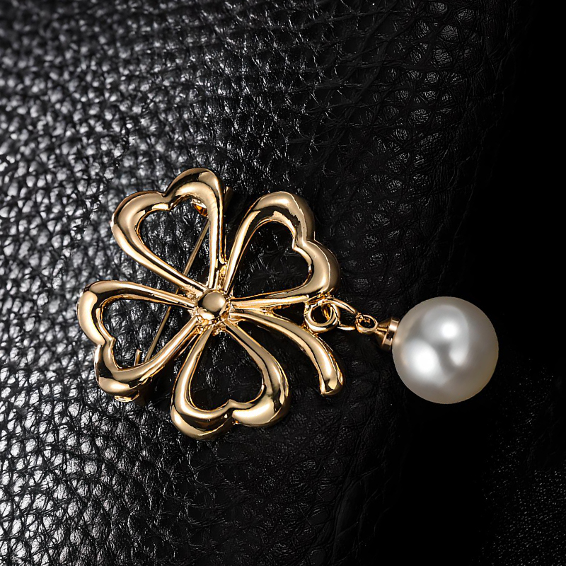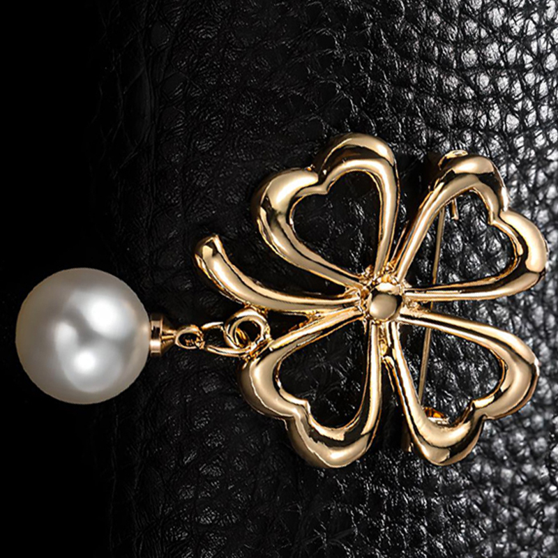 Tibetan Style Brooch, with Plastic Pearl, Four Leaf Clover, gold color plated, for woman & hollow, 29x42mm, Sold By PC