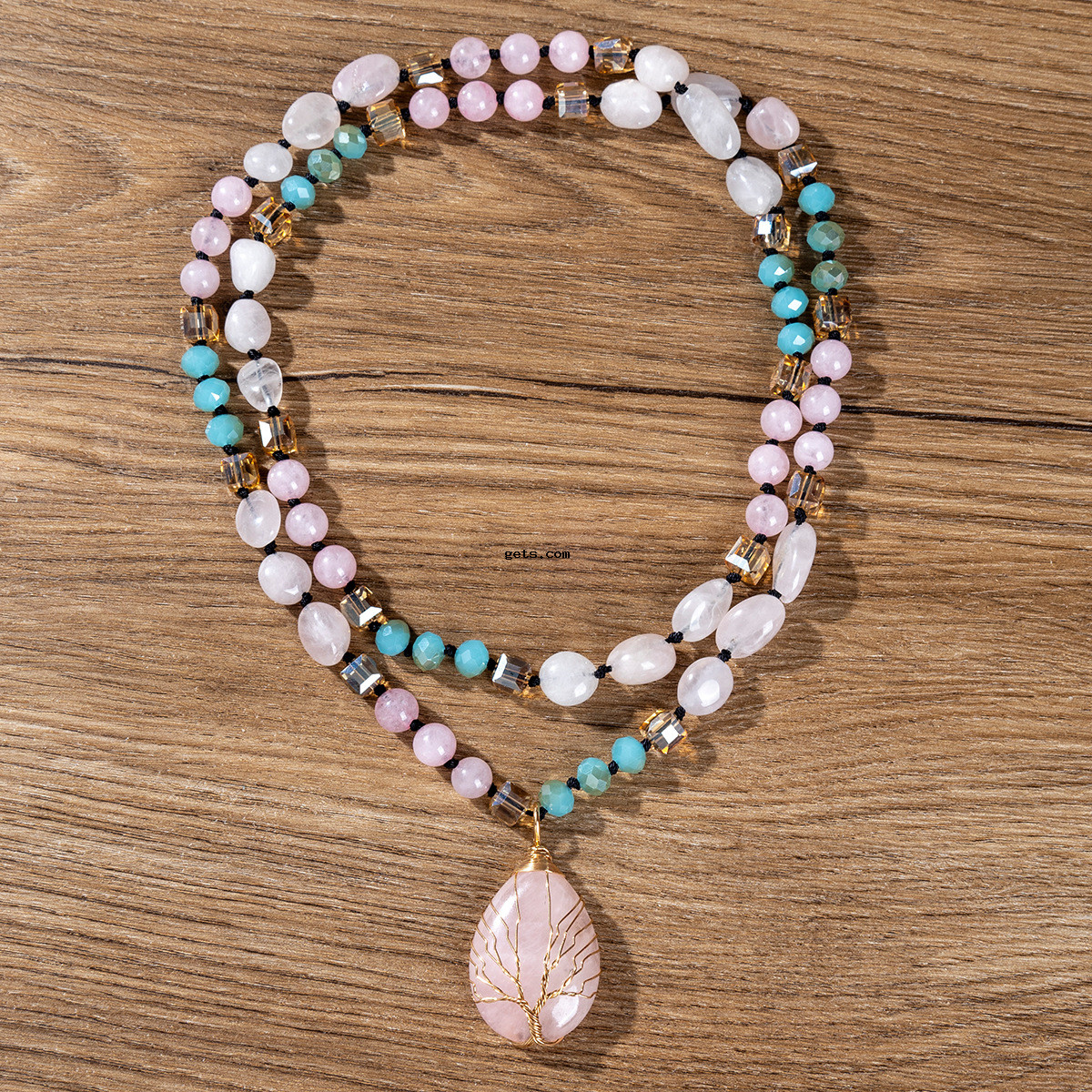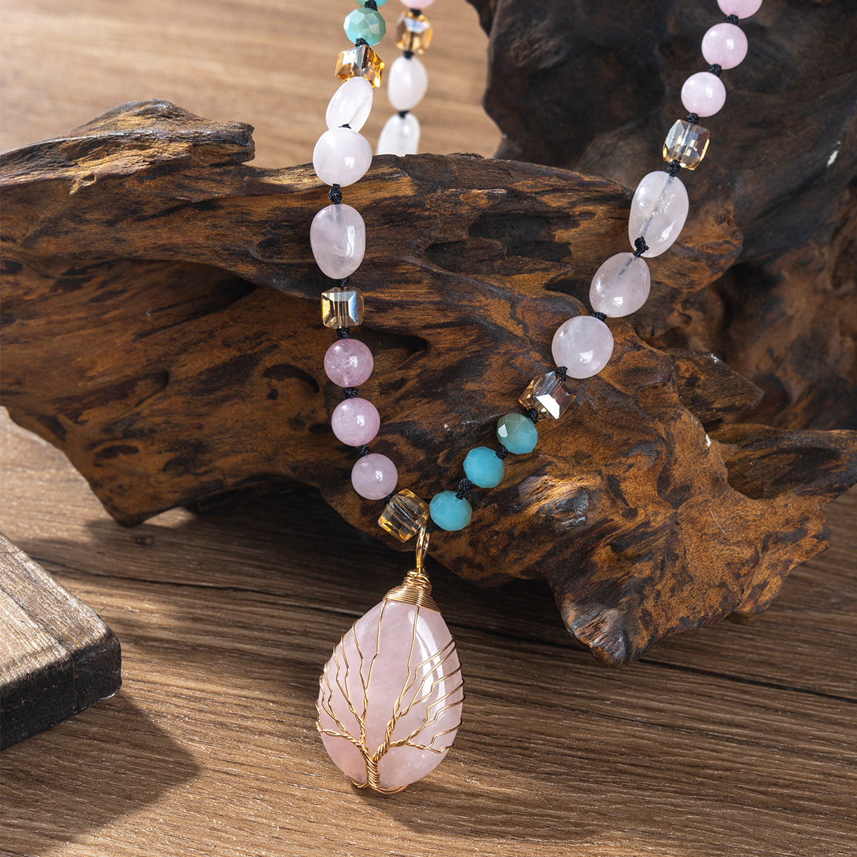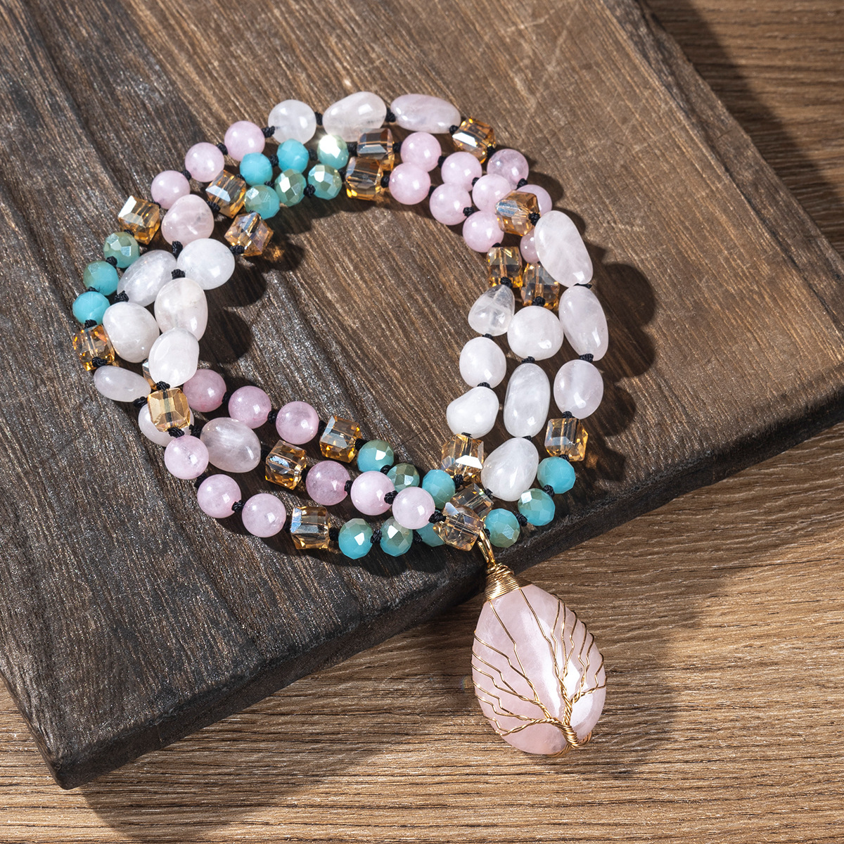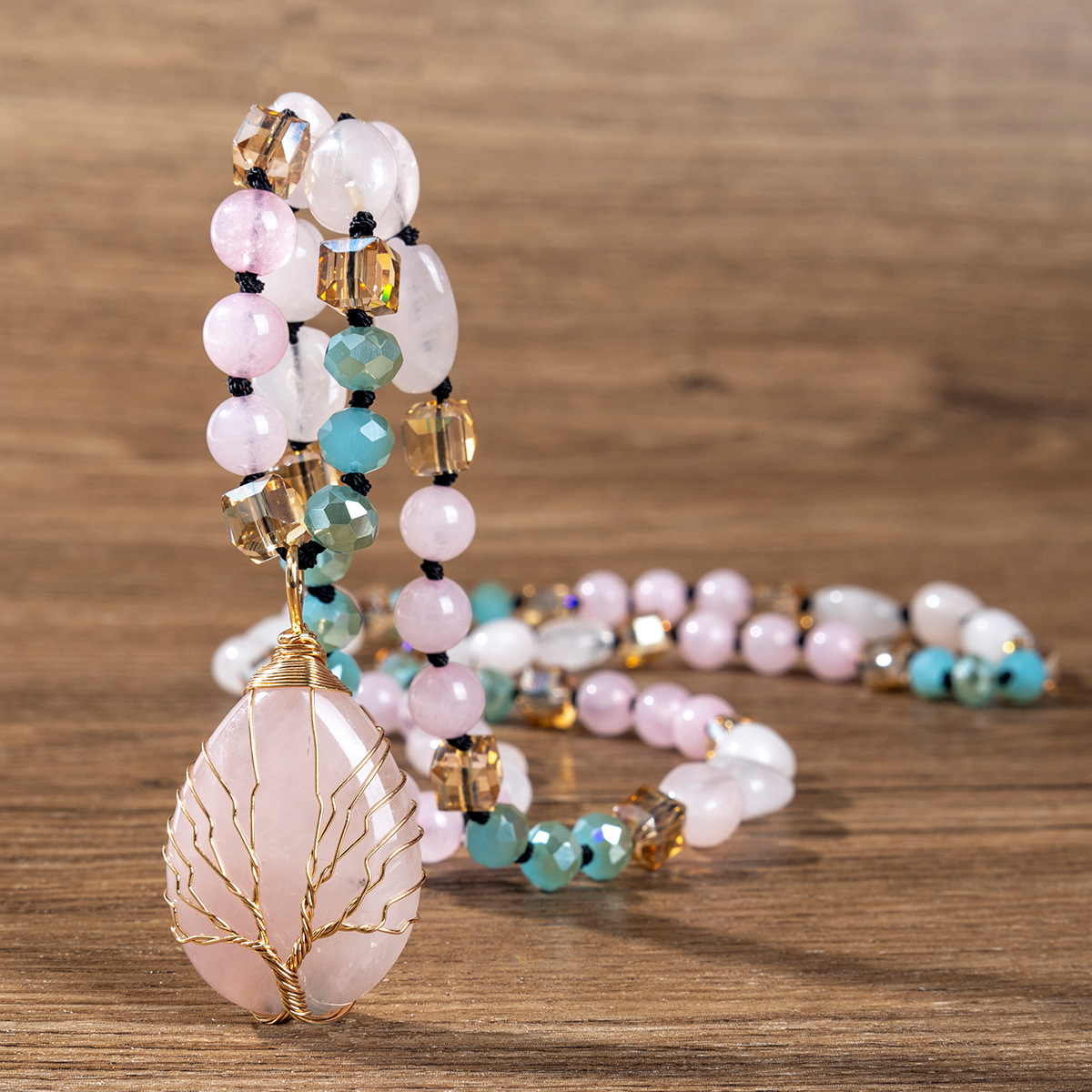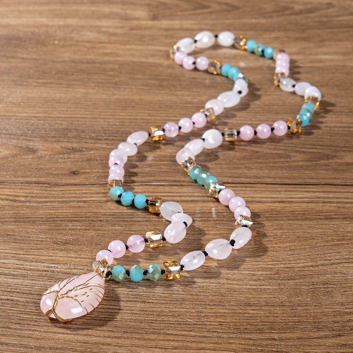 - Quartz Necklace, Rose Quartz, with Polyester Yarns & Gemstone
