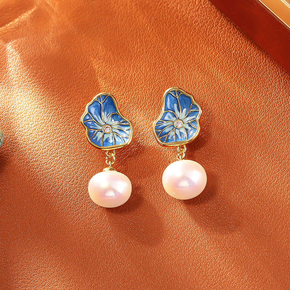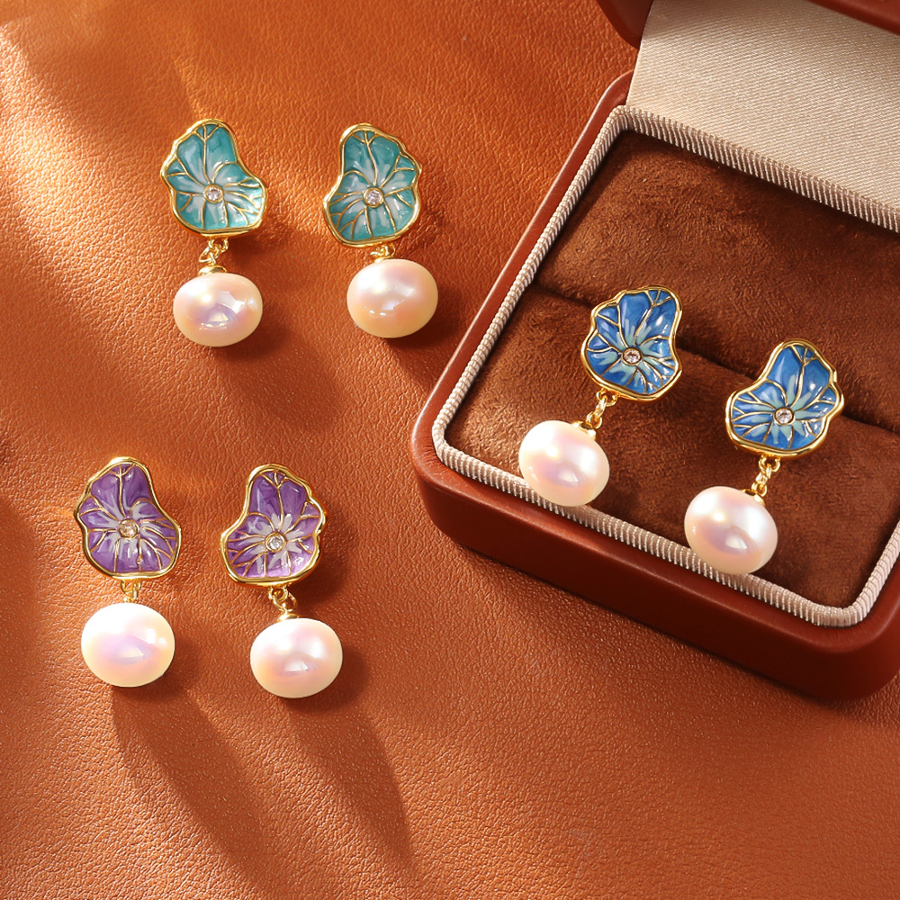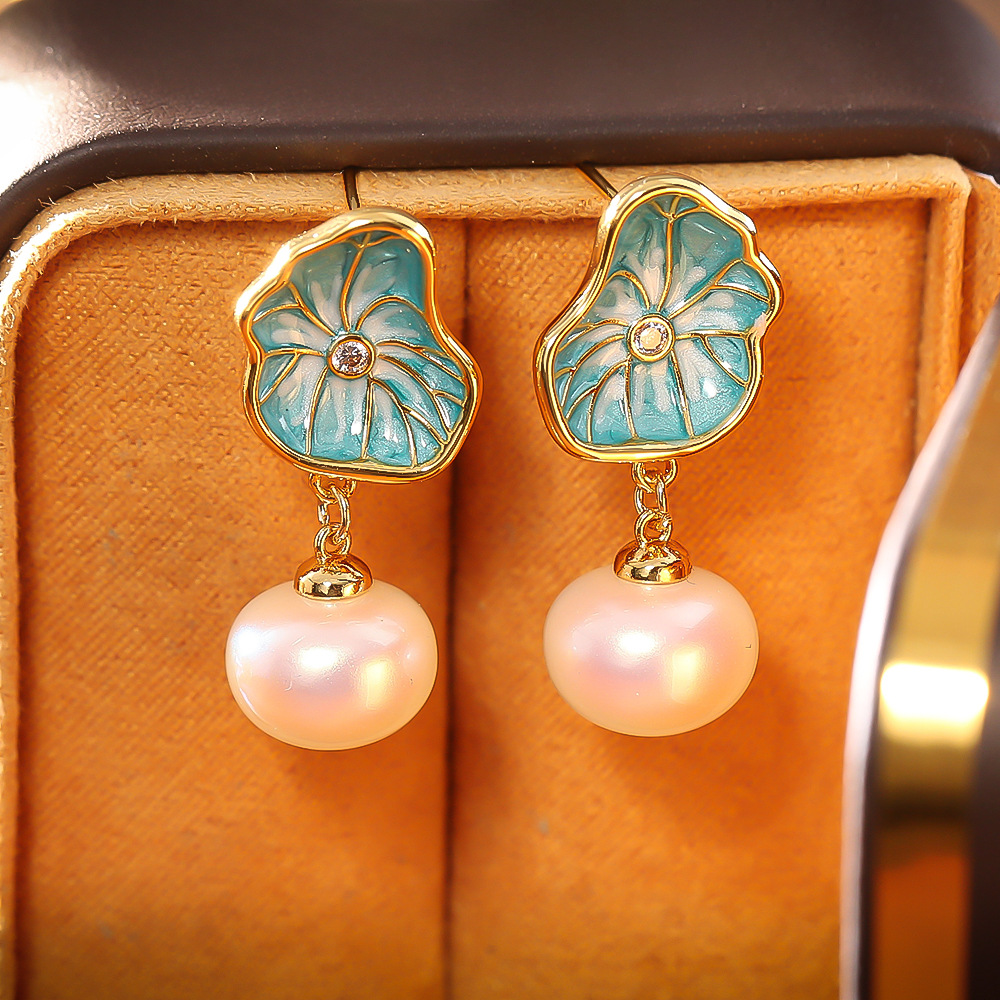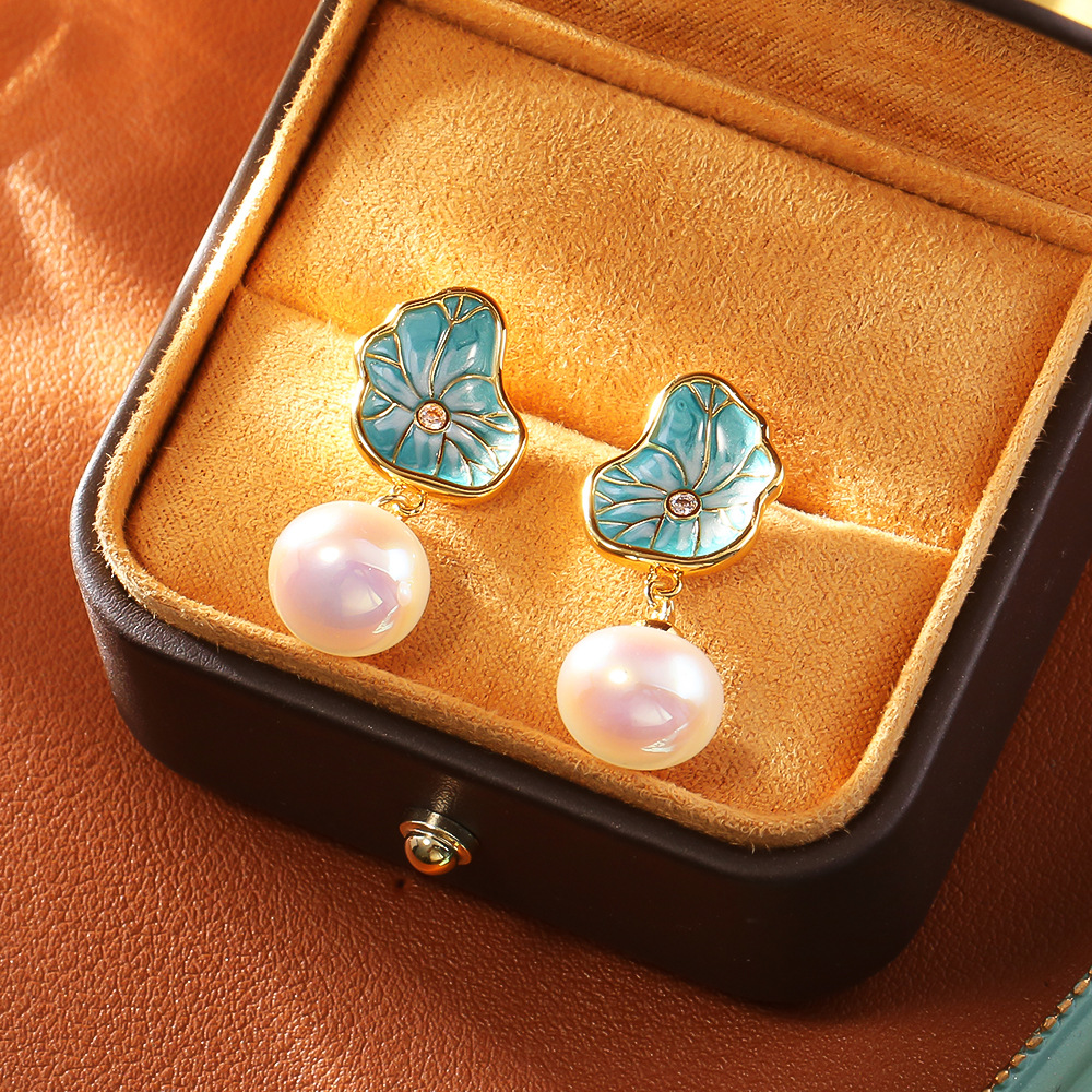South Sea Shell Earring, Brass, with Shell Pearl, Lotus Leaf, real gold plated, micro pave cubic zirconia & for woman & enamel, more colors for choice, Sold By Pair
